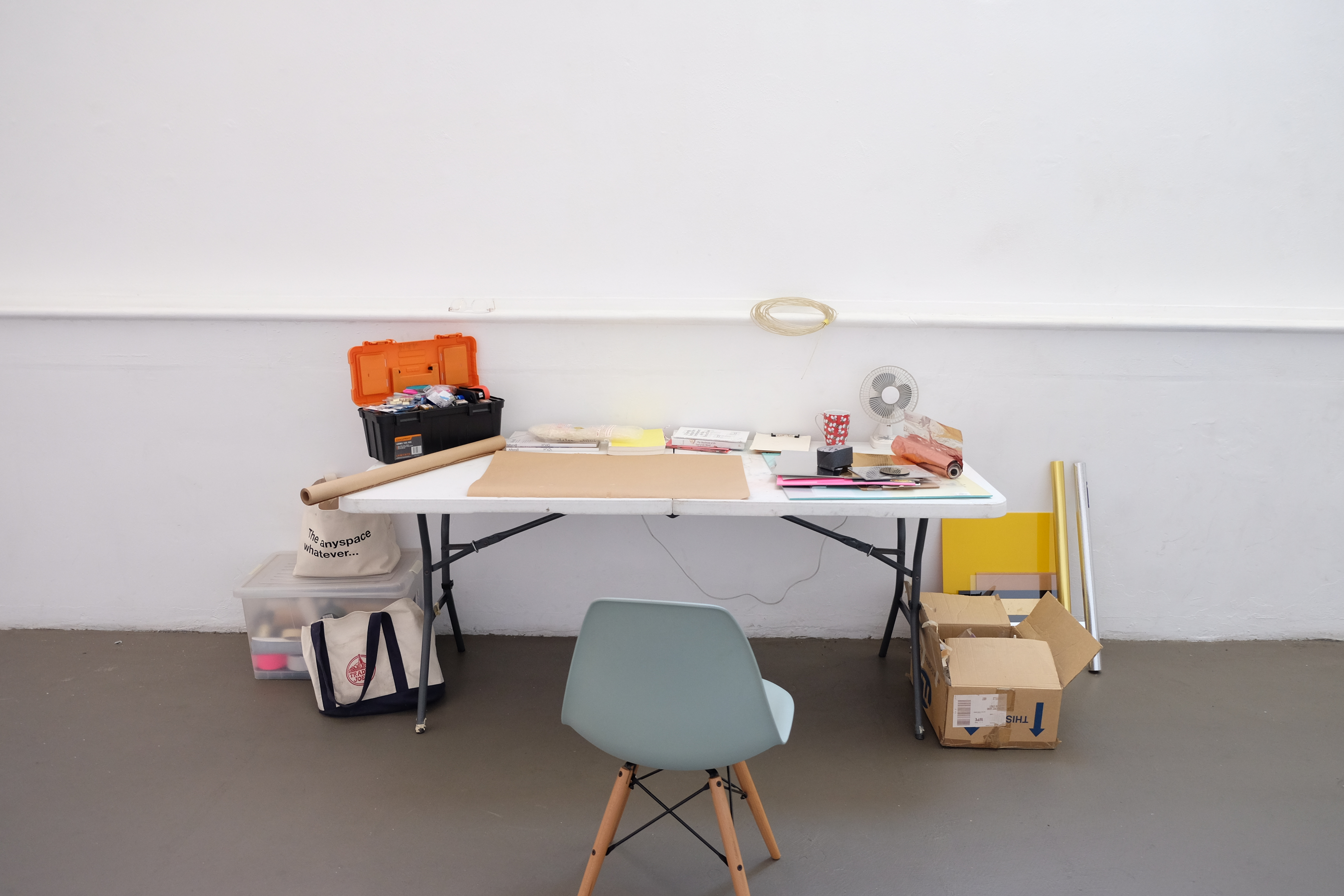 Coming from an architecture background and without any formal training in visual art, Jose Dávila developed a studio practice later in his art career. In a residency Dávila undertook in 2000, in which he struggled to connect to a project in the two short weeks allocated, he constructed for himself a studio which was to be the result of the residency. He says the project came to be “[a] kind of duality in which the result would be the process and the process would be the result” (Craddock & Dávila 2018, 41). Situated outdoors, as a play on the practice of having “open studios”, Open Studio, 2000, consisted of wooden walls and floor, mismatched chairs, a table, and studio paraphernalia. “While I was building, [it] had also become a process of thinking about what a studio is for and all the issues around that. I wasn’t really creating a studio but a ‘stage’ of a studio, a faux studio, a sculpture that resembled a studio” (ibid). Having begun to explore the notion of a residency as a space where all three actions of thinking, making, and showing could take place, I wondered if I could wrestle back some vibrant potential from the uniformity and prosaic nature of a white cube gallery space. This type of question led to a residency projects at Paper Mountain gallery in which I would think about the role of the residency and the gallery and, like Dávila, “the result would be the process and the process would be the result” (ibid).