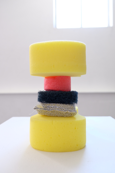 Over the course of the two short weeks my encounters with the materials intensified and the chance to come to know again, or otherwise, the common understandings of utilitarian manufactured goods was a central focus. As an attempt at reinvigorating gallery spaces as somewhere active and dynamic rather than showrooms of consumer ready art, Gallery as Residency was a rather small gesture. In the end I could not entirely avoid the gallery’s expectation of public involvement as Paper Mountain required some form of external engagement. Though I tried to use a panel discussion on the topic of artist residency as sufficing this condition I compromised with a closing night event where I experienced the power of the white cube gallery in creating conformity of practice. My confidence in disrupting the usual interaction of the space waned due to the frequently required explanations to the visitors and gallery volunteers. I also felt the pressure from the white walls and concrete floor to present my time in the space as amounting to something tangible, and so the space was transformed somewhat by the inclusion of plinths and video work. Hoping to maintain a semblance of activity and continuation, the furniture and objects, things and materials were left in their varying states of being engaged with, while plinths held aloft curious forms of sponge, disco balls, and agar blocks. Wall spaces were covered up with video projection and still images of balloons being sanded.