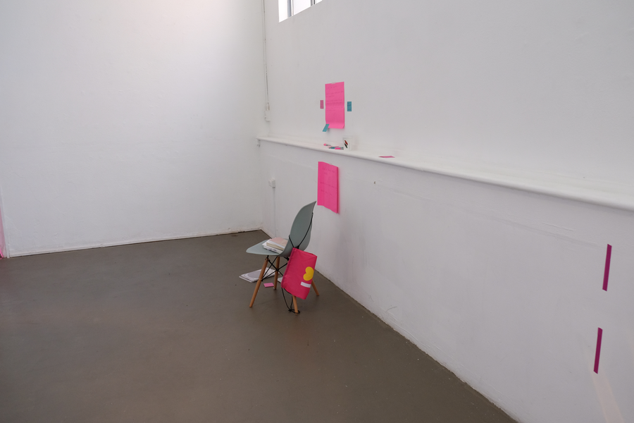 The formulation of a residency space able to contain all aspects of the creative process resulted in explicitly labelling the thinking, making, showing relationship. Early on in Gallery as Residency I played with delineating the gallery space into thirds, using tape to mark out the spaces on the floor and walls, attempting to only conduct actions in their corresponding sections. In a rudimentary fashion I placed a chair, a notepad and books in the first part; in the second, a desk and the objects, things and materials; and in the third, plinths and tables. Janneke Wesseling states that “the exceptional thing about research in and through art is that practical action (the making) and theoretical reflection (the thinking) go hand in hand. The one cannot exist without the other, in the same way action and thought are inextricably linked in artistic practice” (2011, 2). Delineating the space in the gallery wasn’t to say that these stages of thinking, making, and showing occur in this fixed order, but in acting out the actions that a residency encourages, I could externally visualise the process of my practice as these boundaries became increasingly blurred. Presenting the space in thirds that broke down made visible the way creative practice cuts across all three aspects blurring their clear demarcations (think cutting across transversally). In the context of the public nature of Paper Mountain, the separation of space alluded to the processes involved in leading up to what would usually be seen in the 'showing' stage of a project, therefore making available to a public what most projects in the space would withhold.