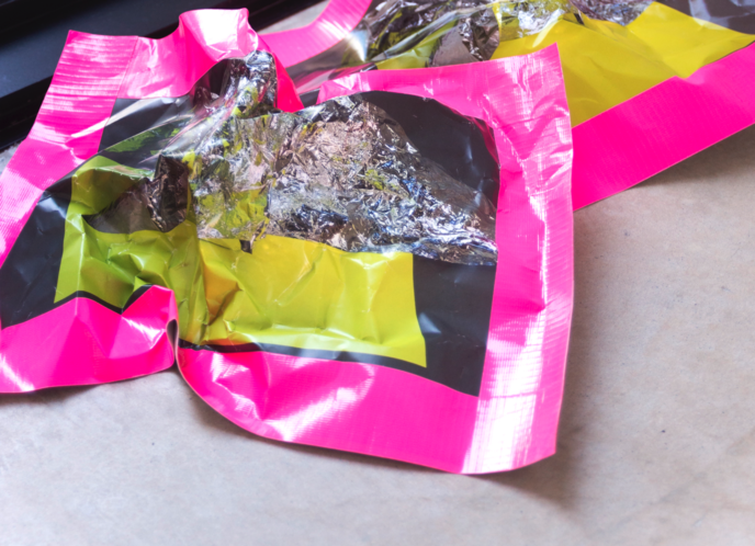 In 2017 I undertook an intensive six-week residency at Another, a small artist-run space housed within a larger building of artist studios in Perth. Being the first planned block of time away from my small studio space at Curtin University, I was yet to know how this time would fit with the rest of the project. Within the loosely converted office building, the rooms with doors were the artist’s studios—carpeted, furnished, stocked full of supplies and “stuff”—while the residency area was the foyer space with makeshift walls and office lino floor that everyone entered into the building through. This residency offered semi-furnishing comprising a trestle table, an office chair, a ladder, and a desk fan. On the first day of the residency, I added a coffee cup, a toolbox, journals, and the last thing I had worked on—a semi-deflated balloon dressed as a disco ball. Over the course of the residency, I scrunched, hung, nailed, coated, flattened, and taped; by all accounts, I gleaned. I often made audio and video recordings of myself and took pictures almost as a reflex to anything that happened in the space. This residency, while four years ago now, still comes back to me and I can recall the space clearly—the light, the quiet, my feelings of apprehension yet excitement. I already felt that this residency would enable me to jump in and get to know my subject matter without too many concerns for aesthetic outcomes, instead supporting development. The space became full of reflective materials like wrapping paper, adhesive vinyl, sequins, and mirrors, as well as miscellaneous things like streamers, balloons, coloured card, various types of tape, and aluminium foil. At this stage in the project, I was still uncertain about the types of matter that might appear more than others. It became clear through my time in the residency space that I was encountering the various objects and materials at hand in a neutral environment due to its retrofitting in a previously occupied space. Its slightly awkward angles, less than solid walls, discoloured linoleum floor—in other words, its inconveniences—made it innocuous and more neutral than the designed neutrality of a white cube gallery space. The subject matter didn’t become something more just by being in the space; things weren’t elevated to demand attention, and the space didn’t change their reading like a gallery might. I could be in proximity with the objects, things and materials anew, and allow intuition and curiosity to drive interactions that helped shift my relationship with and to them.