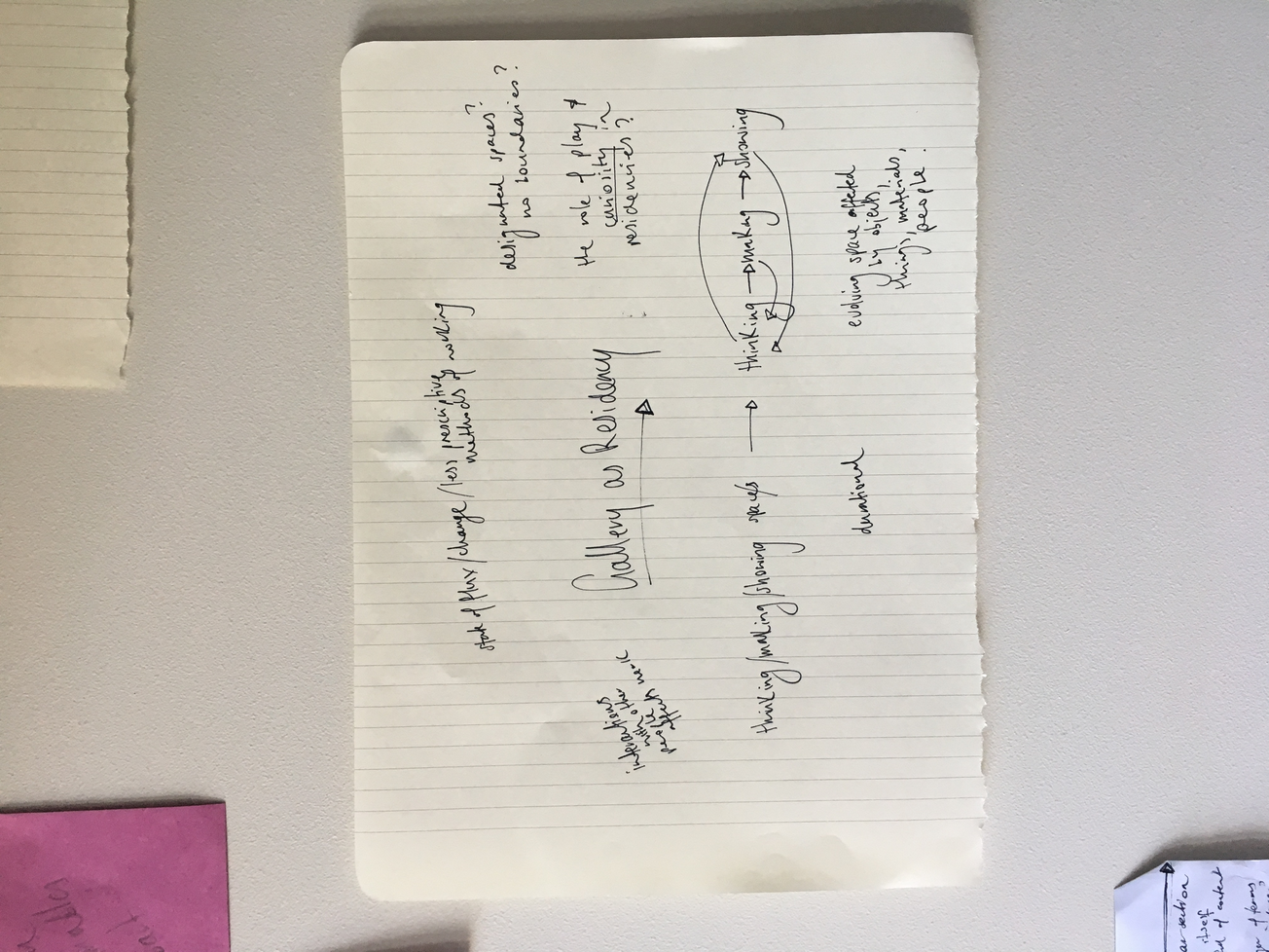Coming from an architecture background and without any formal training in visual art, Jose Dávila developed a studio practice later in his art career. In a residency Dávila undertook in 2000, in which he struggled to connect to a project in the two short weeks allocated, he constructed for himself a studio which was to be the result of the residency. He says the project came to be “[a] kind of duality in which the result would be the process and the process would be the result” (Craddock & Dávila 2018, 41). Situated outdoors, as a play on the practice of having “open studios”, Open Studio, 2000, consisted of wooden walls and floor, mismatched chairs, a table, and studio paraphernalia. “While I was building, [it] had also become a process of thinking about what a studio is for and all the issues around that. I wasn’t really creating a studio but a ‘stage’ of a studio, a faux studio, a sculpture that resembled a studio” (ibid). Having begun to explore the notion of a residency as a space where all three actions of thinking, making, and showing could take place, I wondered if I could wrestle back some vibrant potential from the uniformity and prosaic nature of a white cube gallery space. This type of question led to a residency projects at Paper Mountain gallery in which I would think about the role of the residency and the gallery and, like Dávila, “the result would be the process and the process would be the result” (ibid).
