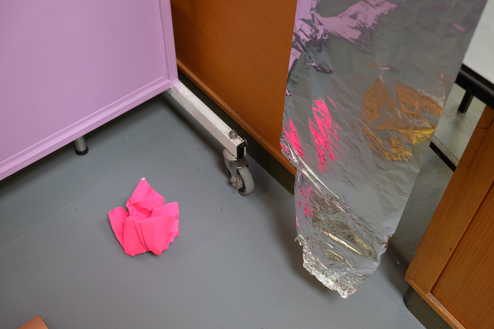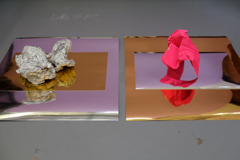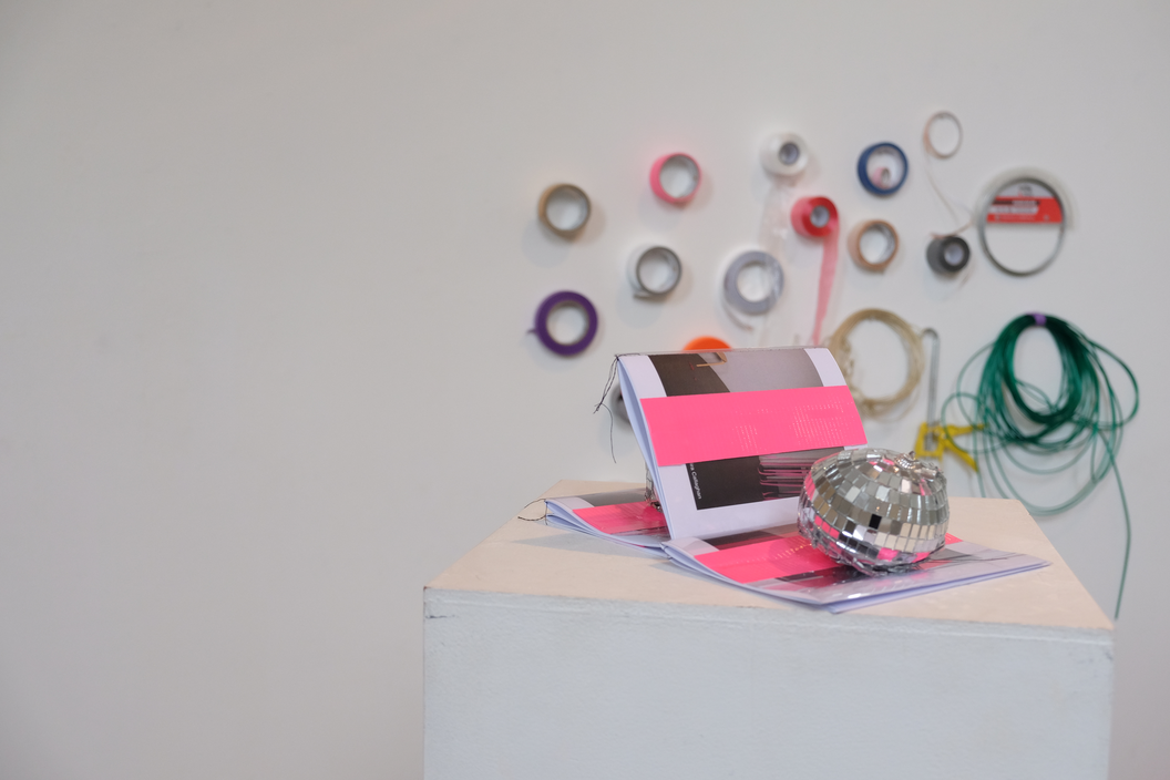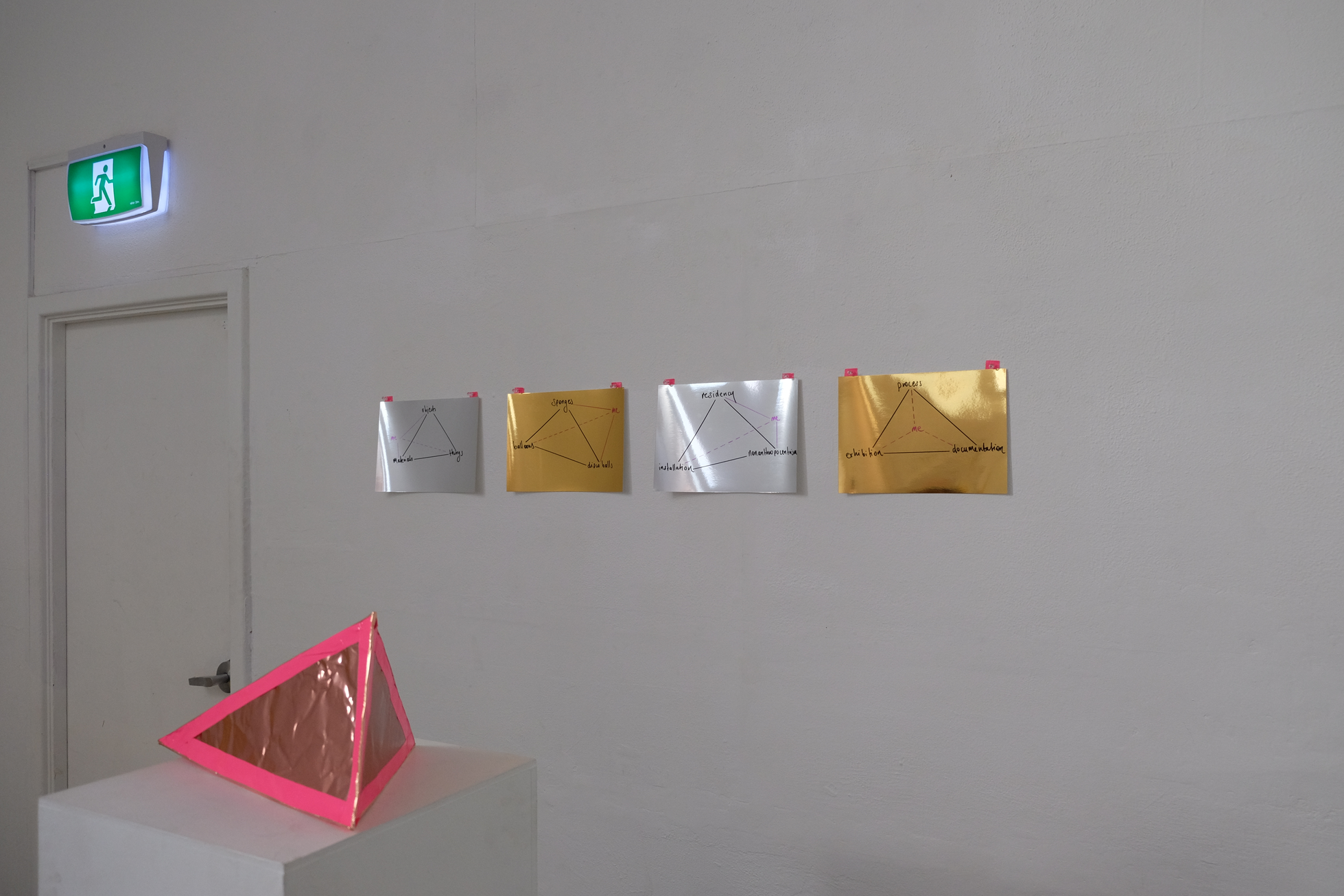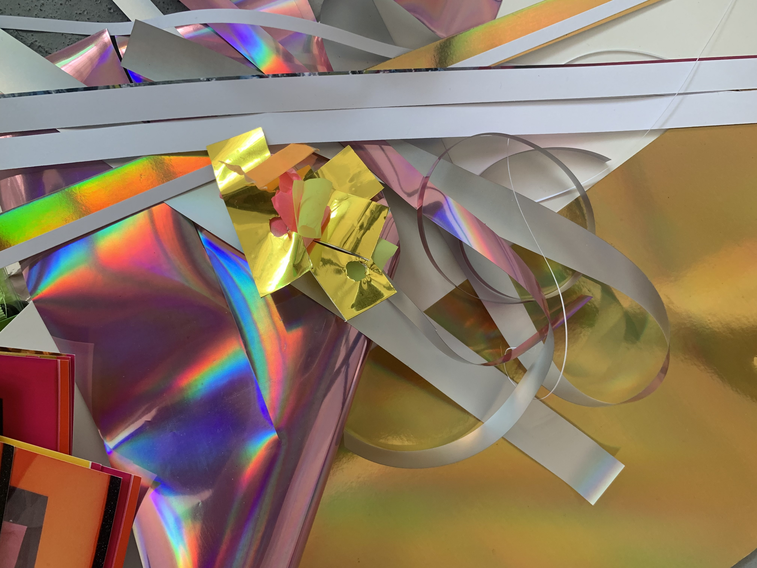 In 2017 I undertook an intensive six-week residency at Another, a small artist-run space housed within a larger building of artist studios in Perth. Being the first planned block of time away from my small studio space at Curtin University, I was yet to know how this time would fit with the rest of the project. Within the loosely converted office building, the rooms with doors were the artist’s studios—carpeted, furnished, stocked full of supplies and “stuff”—while the residency area was the foyer space with makeshift walls and office lino floor that everyone entered into the building through. This residency offered semi-furnishing comprising a trestle table, an office chair, a ladder, and a desk fan. On the first day of the residency, I added a coffee cup, a toolbox, journals, and the last thing I had worked on—a semi-deflated balloon dressed as a disco ball. Over the course of the residency, I scrunched, hung, nailed, coated, flattened, and taped; by all accounts, I gleaned. I often made audio and video recordings of myself and took pictures almost as a reflex to anything that happened in the space. This residency, while four years ago now, still comes back to me and I can recall the space clearly—the light, the quiet, my feelings of apprehension yet excitement. I already felt that this residency would enable me to jump in and get to know my subject matter without too many concerns for aesthetic outcomes, instead supporting development. The space became full of reflective materials like wrapping paper, adhesive vinyl, sequins, and mirrors, as well as miscellaneous things like streamers, balloons, coloured card, various types of tape, and aluminium foil. At this stage in the project, I was still uncertain about the types of matter that might appear more than others. It became clear through my time in the residency space that I was encountering the various objects and materials at hand in a neutral environment due to its retrofitting in a previously occupied space. Its slightly awkward angles, less than solid walls, discoloured linoleum floor—in other words, its inconveniences—made it innocuous and more neutral than the designed neutrality of a white cube gallery space. The subject matter didn’t become something more just by being in the space; things weren’t elevated to demand attention, and the space didn’t change their reading like a gallery might. I could be in proximity with the objects, things and materials anew, and allow intuition and curiosity to drive interactions that helped shift my relationship with and to them.
