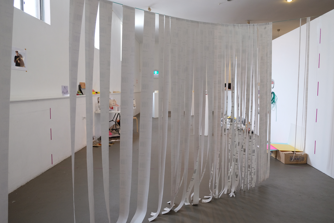 The formulation of a residency space able to contain all aspects of the creative process resulted in explicitly labelling the thinking, making, showing relationship. Early on in Gallery as Residency I played with delineating the gallery space into thirds, using tape to mark out the spaces on the floor and walls, attempting to only conduct actions in their corresponding sections. In a rudimentary fashion I placed a chair, a notepad and books in the first part; in the second, a desk and the objects, things and materials; and in the third, plinths and tables. Janneke Wesseling states that “the exceptional thing about research in and through art is that practical action (the making) and theoretical reflection (the thinking) go hand in hand. The one cannot exist without the other, in the same way action and thought are inextricably linked in artistic practice” (2011, 2). Delineating the space in the gallery wasn’t to say that these stages of thinking, making, and showing occur in this fixed order, but in acting out the actions that a residency encourages, I could externally visualise the process of my practice as these boundaries became increasingly blurred. Presenting the space in thirds that broke down made visible the way creative practice cuts across all three aspects blurring their clear demarcations (think cutting across transversally). In the context of the public nature of Paper Mountain, the separation of space alluded to the processes involved in leading up to what would usually be seen in the 'showing' stage of a project, therefore making available to a public what most projects in the space would withhold.