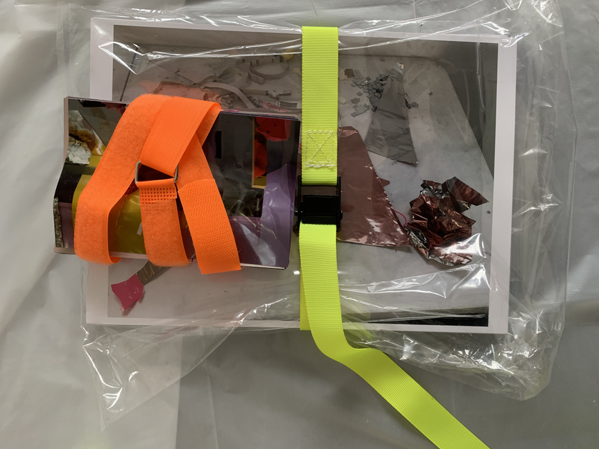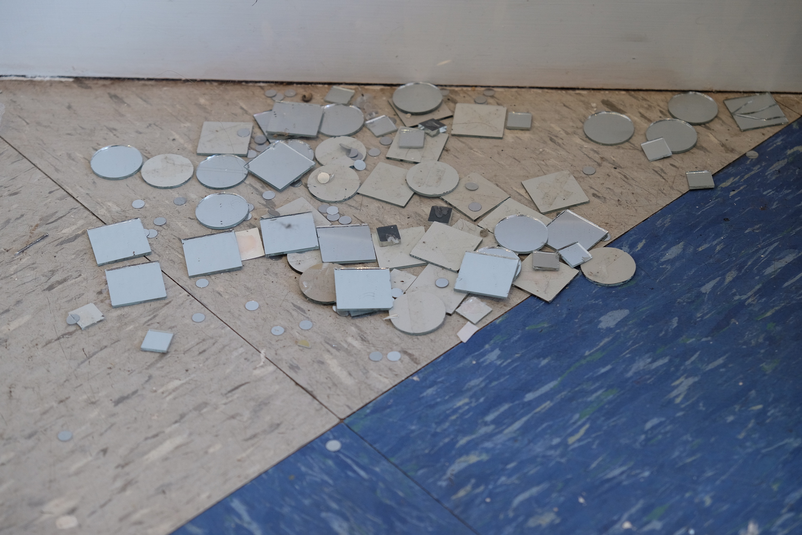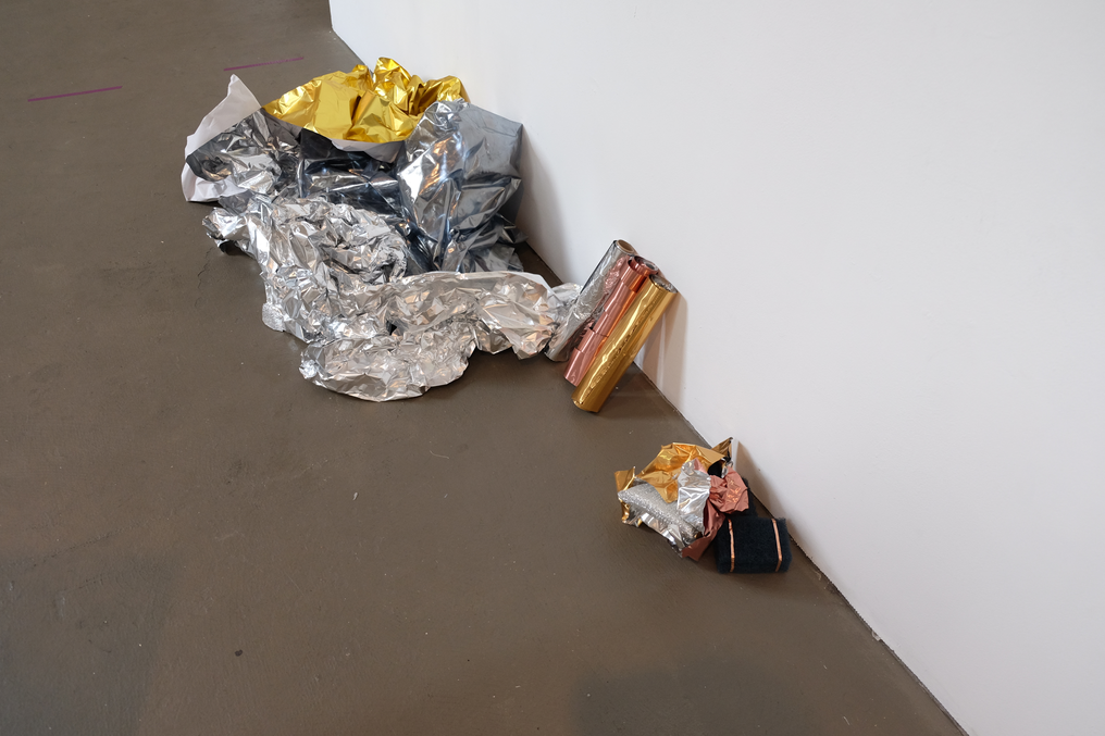 In 2017 I undertook an intensive six-week residency at Another, a small artist-run space housed within a larger building of artist studios in Perth. Being the first planned block of time away from my small studio space at Curtin University, I was yet to know how this time would fit with the rest of the project. Within the loosely converted office building, the rooms with doors were the artist’s studios—carpeted, furnished, stocked full of supplies and “stuff”—while the residency area was the foyer space with makeshift walls and office lino floor that everyone entered into the building through. This residency offered semi-furnishing comprising a trestle table, an office chair, a ladder, and a desk fan. On the first day of the residency, I added a coffee cup, a toolbox, journals, and the last thing I had worked on—a semi-deflated balloon dressed as a disco ball. Over the course of the residency, I scrunched, hung, nailed, coated, flattened, and taped; by all accounts, I gleaned. I often made audio and video recordings of myself and took pictures almost as a reflex to anything that happened in the space. This residency, while four years ago now, still comes back to me and I can recall the space clearly—the light, the quiet, my feelings of apprehension yet excitement. I already felt that this residency would enable me to jump in and get to know my subject matter without too many concerns for aesthetic outcomes, instead supporting development. The space became full of reflective materials like wrapping paper, adhesive vinyl, sequins, and mirrors, as well as miscellaneous things like streamers, balloons, coloured card, various types of tape, and aluminium foil. At this stage in the project, I was still uncertain about the types of matter that might appear more than others. It became clear through my time in the residency space that I was encountering the various objects and materials at hand in a neutral environment due to its retrofitting in a previously occupied space. Its slightly awkward angles, less than solid walls, discoloured linoleum floor—in other words, its inconveniences—made it innocuous and more neutral than the designed neutrality of a white cube gallery space. The subject matter didn’t become something more just by being in the space; things weren’t elevated to demand attention, and the space didn’t change their reading like a gallery might. I could be in proximity with the objects, things and materials anew, and allow intuition and curiosity to drive interactions that helped shift my relationship with and to them.