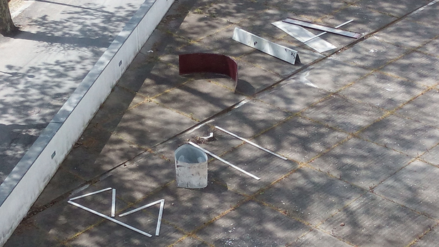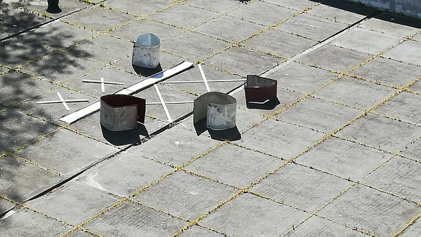 The courtyard became the space and the context where it was possible to establish messages with the neighbours. Due to its privileged location, by being at a lower level, all the balconies and windows could set visual contact and allowed other kinds of interactions such as brief conversations. Moreover, the space had the particularity of having abandoned remains of the building's facade itself such as metallic sheets and traces of blinds. These abandoned remains made possible, at a distance, the creation of legible shapes and interaction messages.