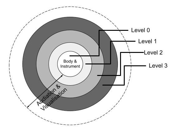 Finally, “Immersive Musical Imagination” was explained to encompass audiation and visualisation. This was explained using Figure 5.1, which appeared in the toolkit. Under each level, the toolkit outlined which situations would correspond to the level of external focus. It was made clear to the participants in the handout and the workshop that the focus should be on the intended result of moving your body and not the motion itself.