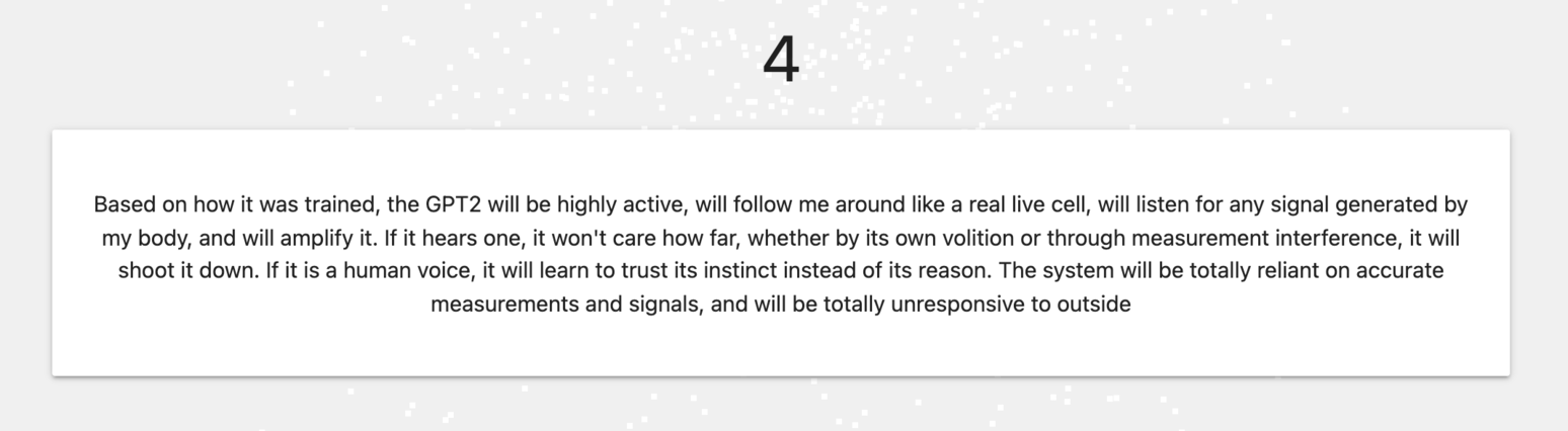 For the Brain Machine Dérive installation we used the "Generative Pre-Trained Transformers 2" language model, "GPT-2", released in 2019. The code architecture is similar to existing language models, but the GPT-2 was trained with the gigantic dataset "WebText" - 40GB of pure text. Our own fine-tuning of the GPT-2 model, on a collection of texts from the Neuromatic Game Art research group as well as techno philosophical texts took several hours of pure computation time.