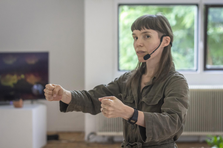 The choreographic movement material (gestures) were simultaneously trained to deliberately mismatch spoken content as if coming too early or too late. When working on this speech we also explored how choreographic composition and thinking in relation to technology as a process (as a relationship in time and place), can convey other type of understanding or feelings than a text can do only through words.