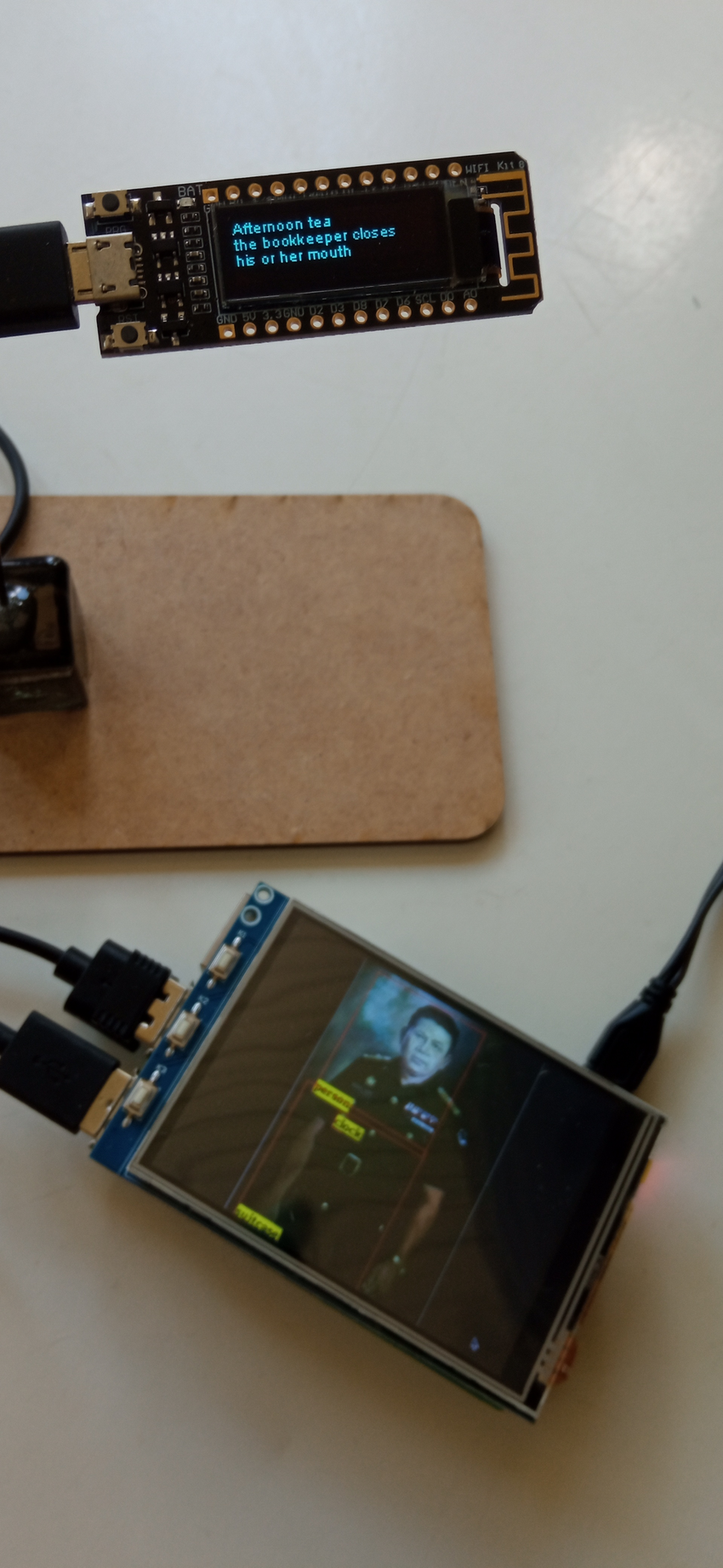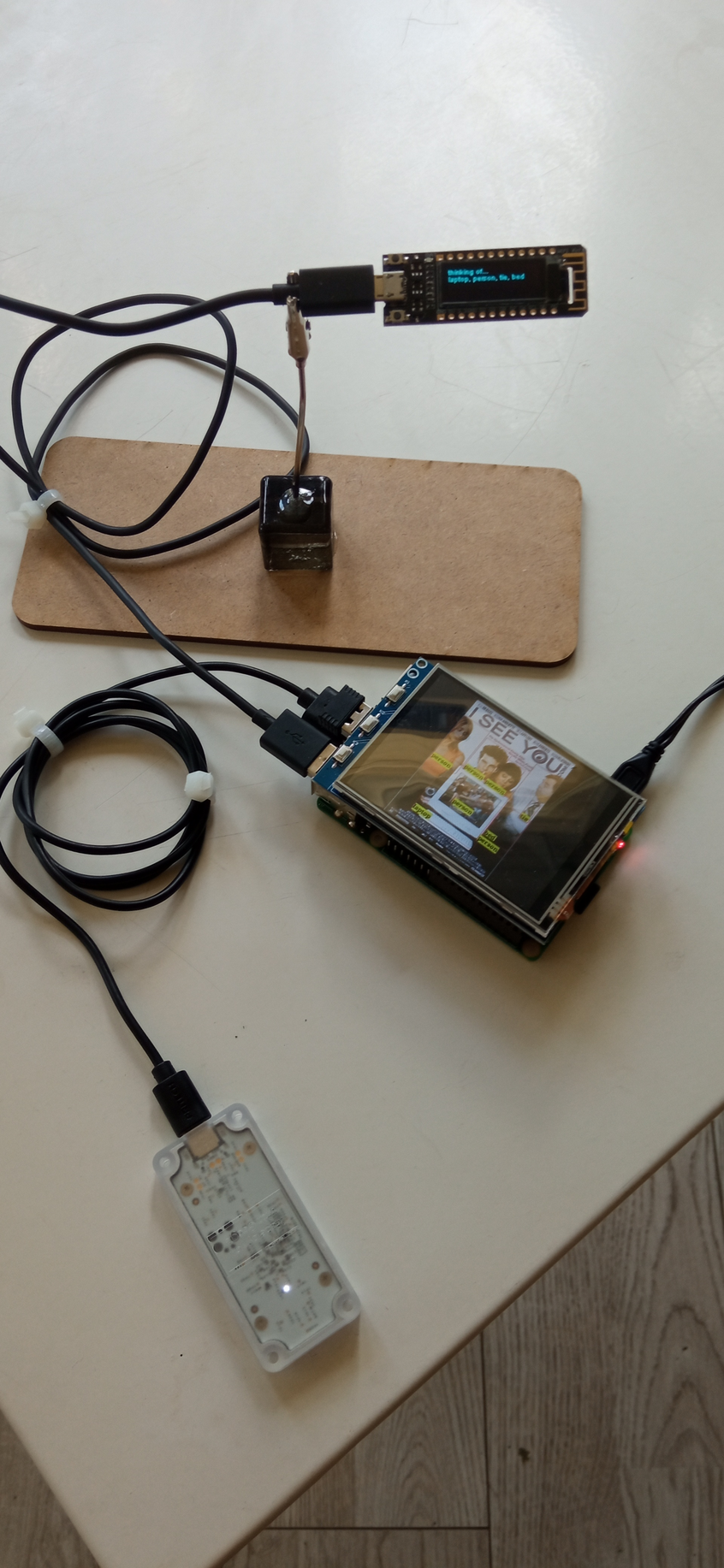 The piece runs on a single board computer connected to the Internet. This device is equipped with a Google Coral TPU, an accessory that allows cheap computers to run inferences, that is, to use AI models that make classifications and other processing intensive tasks. It is useful for machine vision tasks, such as video surveillance. It is used here not with live images, but by retrieving random picture files from wikipedia. The reason for using an online source instead of a camera is that the local solution would offer not much input variation - there are only a few different objects that can be found at a gallery.