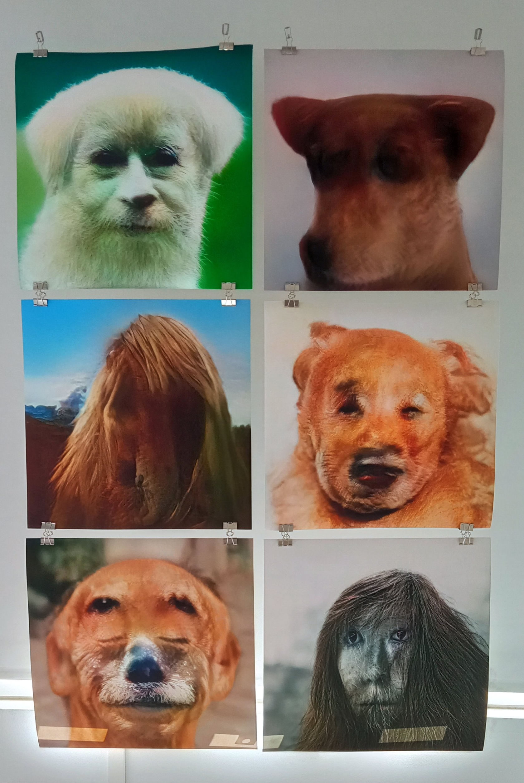 In the work created for the exhibition, I still worked with the Flickr Faces dataset model. In order to disrupt the tool, my technique was to feed the architecture with faces of animals. Since they bear features common to human faces (eye, mouth…), I supposed correctly that animal-like humans (or human looking animals) could be found. The search is a labor intensive task, since it can be run multiple times, with different random results for each input; the pieces are the result of my personal curatorship.