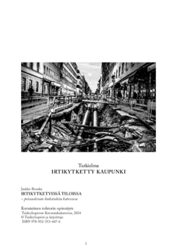Käytöstä poistetun junaradan syrjäinen seutu, jossa tuuli heiluttaa radalle kasvaneita pusikoita, on luontevaa hahmottaa irtikytketyksi tilaksi. Paljon vaikeampaa on kuvitella se, että irtikytkentä voisi tapahtua nykyaikaisen kaupungin urbaanissa tilassa. Ajattelen kaupungin nyt sellaiseksi paikaksi, joka Doreen Masseyn mukaan muodostaa polttopisteen taloudellisten, poliittisten ja kulttuuristen sosiaalisten suhteiden konstellaatioille ja sekoittaa paikalliset ja laajemmat suhteet toisiinsa (Massey 2008, 29–31). Koska kaupunki on näiden suhteiden fyysinen paikka, se näyttäytyy liikkuvien ihmisruumiiden polttopisteenä. Tässä taiteellisessa tutkimuksessa irtikytkentä sittenkin esiintyy kaupungin urbaanissa tilassa. Vaikka ihmisten välisten kytköksien monimutkaiset verkostot eivät koronapandemiassa täysin hajonneetkaan, koronapandemia hajotti kaupungin ruumiidenvälisten kohtaamisten paikkana. Sulkutilaan ajautunut kaupunki muuttui yksinäisen päämäärättömän kuljeskelun tilaksi.