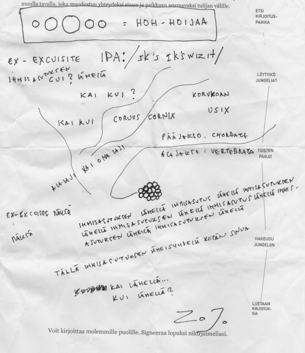 Harjoitteessamme osallistujat kutsuttiin leikkiin, joka asetti heidät vastuuseen yhteisen tilan muodostumisesta. Leikin viehätys motivoi heidän yrityksiään ymmärtää toistensa kirjoituksia. Se motivoi myös etsimään sellaisia ilmaisuja, jotka välittyisivät toisille. Leikkisyyden merkitys korostui harjoitteessa erityisesti silloin, kun se toteutettiin englanniksi osana Tutkimuspaviljonkia 20.6.2021. Silloin harjoitteeseen osallistuneista ei kukaan puhunut englantia äidinkielenään. Niinpä harjoitteessa käytetyt ilmaisut saattoivat olla kömpelömpiä kuin siinä tapauksessa, että ne olisi ilmaistu äidinkielellä. Harjoitteen teksteissä käytetyt ilmaisut saattoivat poiketa kielioppisäännöistä siksikin, että niihin sekoittui muiden kielten lauserakenteita ja käännettyjä ilmaisuja.