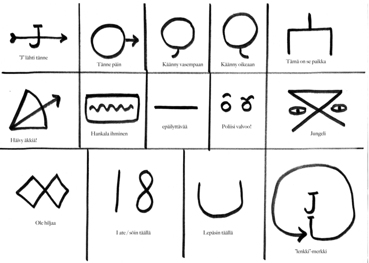 Tätä kokoamaani listaa hobomerkeistä selityksineen käytettiin harjoitteessa. Kulkureittiä ja kirjoituspaikkaa osoittavien merkkien lisäksi harjoitteeseen kuului siis merkkejä, joilla osallistujat voivat neuvoa tai varoittaa toisiaan. Esimerkiksi ”hankala ihminen” -merkillä varoitettiin epämiellyttävistä kohtaamisista alueella liikkuvien ihmisten kanssa. "Poliisi valvoo” -merkillä varoitettiin laajasti kaikenlaisesta valvonnasta. "Jungeli" -merkillä taas osoitettiin se paikka, johon harjoitteen lopuksi kokoonnutaan.