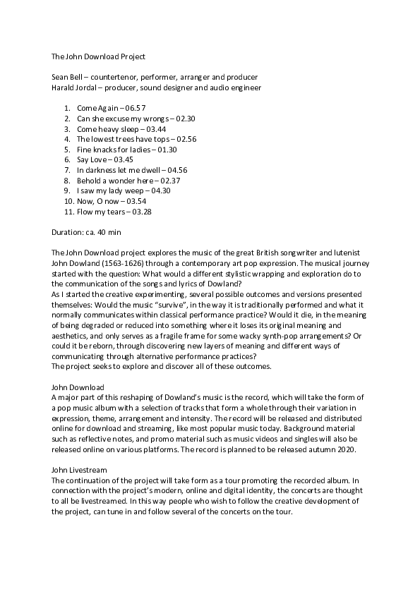 The project that has contributed the most to this development is the ongoing “The John Download Project”, in collaboration with composer, producer and sound designer Harald Jordal. The project explores the music of the great British songwriter and lutenist John Dowland (1563-1626) through a contemporary art-pop expression. It takes the shape of a full-length pop-music album, with eleven tracks that together create an entity through their variation in expression, theme, arrangement and intensity. Each song explores different styles and moods. Some use contrast as a comical and surprising element, while others try to find artistic honesty through the arrangement and performance.