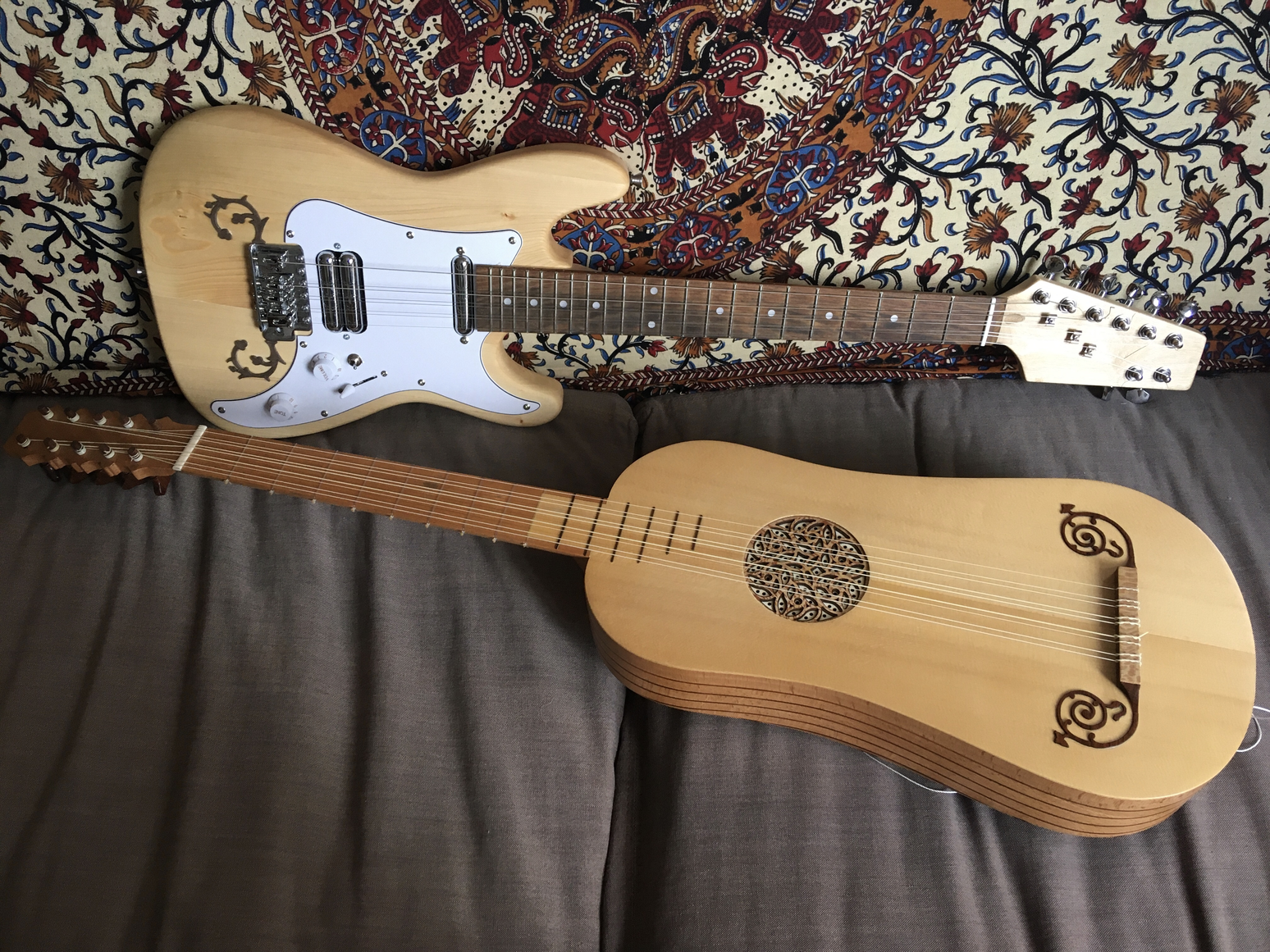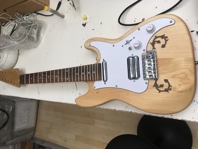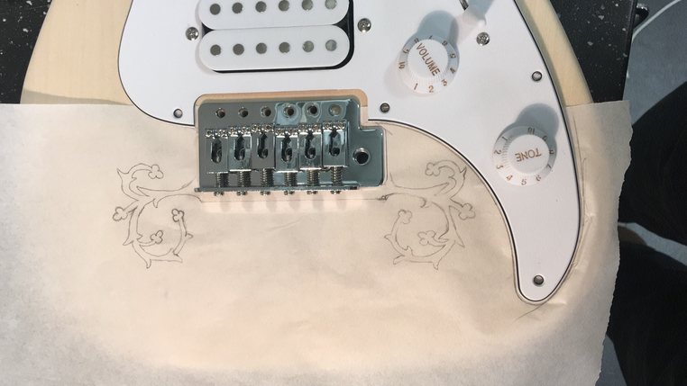 The ornaments where then 3D printed with PLA with wood fibres, and glued onto the body of the guitar