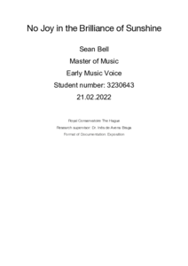 Sean Bell Student number: 3230643 Master Early Music Voice Research supervisor: Dr. Inês de Avena Braga Title: No Joy in the Brilliance of Sunshine Research question: How can I create a stage performance combining and connecting my two sound worlds/style identities as a performer? Summary of the results of the research: In this research I have explored the creative development of a stage performance, combining operatic music by Handel with contemporary performance art. Through this I have explored how I can combine my duality as a performer: the early music singer and the contemporary performer and creator. This project and its connected research are a part of my artistic development as a musician, creator and performer, and the urge to explore this music and questions grew out of previous projects and ideas. I have created and developed my project through following a consequential progression of artistic choices, and through this space that has unfolded I have come to find an essential identity of myself as a performer and creator. By being honest towards myself through the critical reflection, I have been able to investigate my process, my preferences, inspirations and my distinct personal style. Through this I have been able to strengthen my artistic identity and the artistic tools I use, bringing forth a more complete performer. Short biography: Sean Bell is a countertenor and performance artist from Oslo. His studies centre mainly on chamber and sacred music and opera, yet also includes a focus on new ideas and methods of interpreting classical and contemporary repertoire. Through sonic imaginations and arrangements, he explores this repertoire in new ways. This has led him to a series of collaborations and solo performances on the border line between classical music and performance art. Bell also works with contemporary music and has premiered several pieces for countertenor. He is an active improviser, plays baroque guitar and engages in instrument building and music electronics.