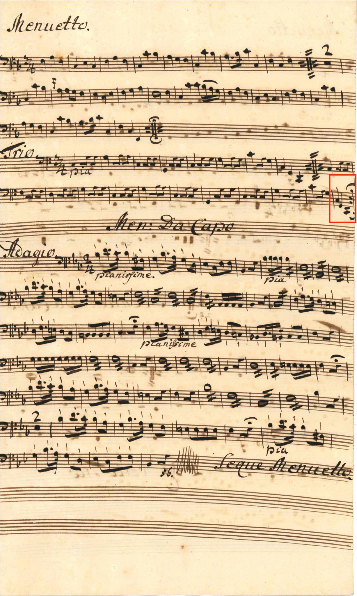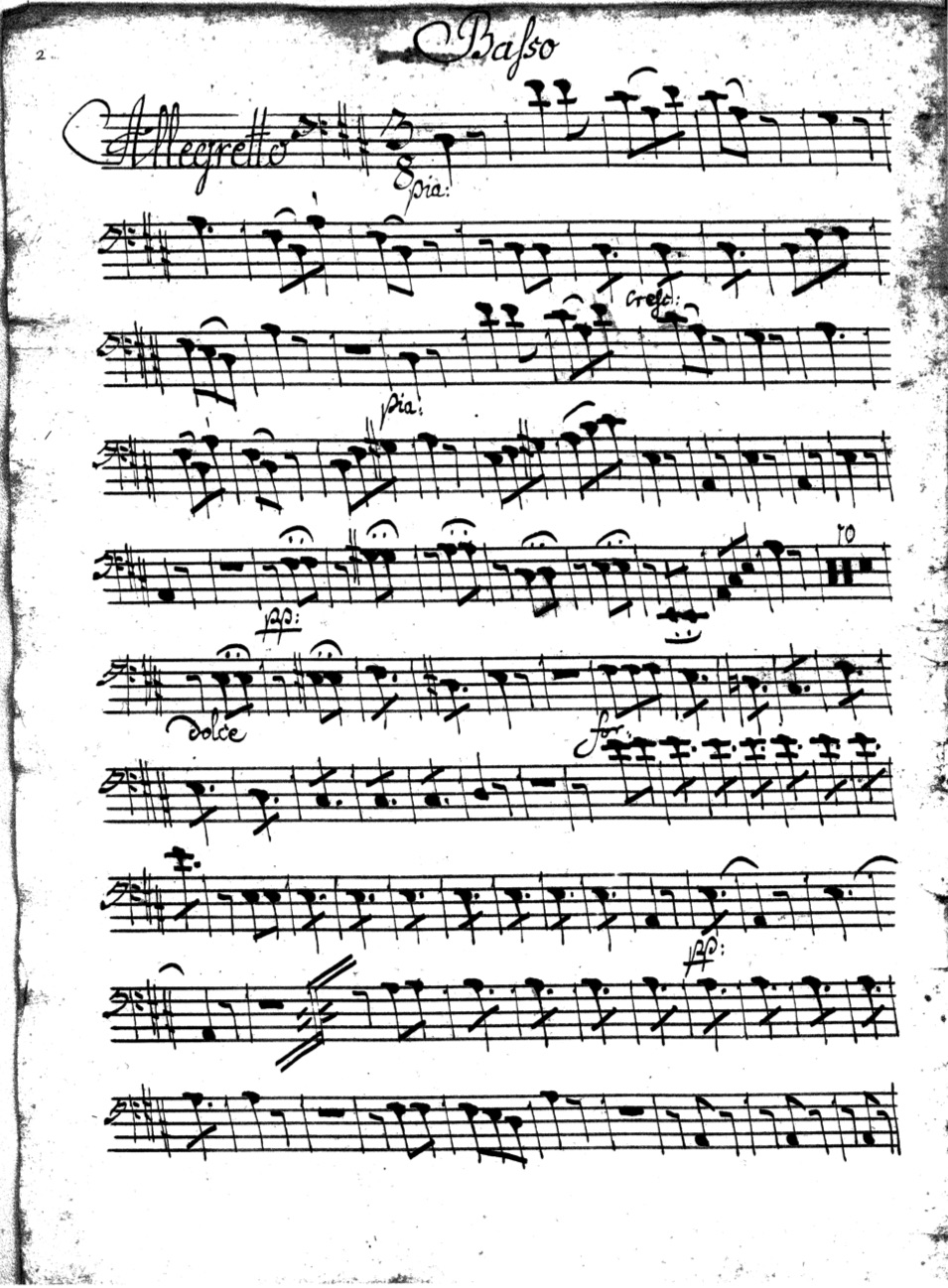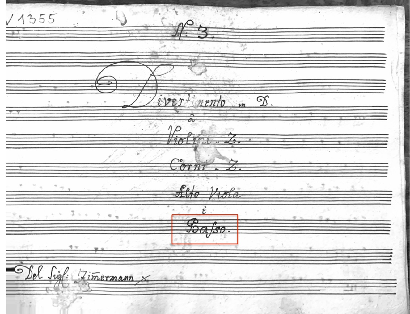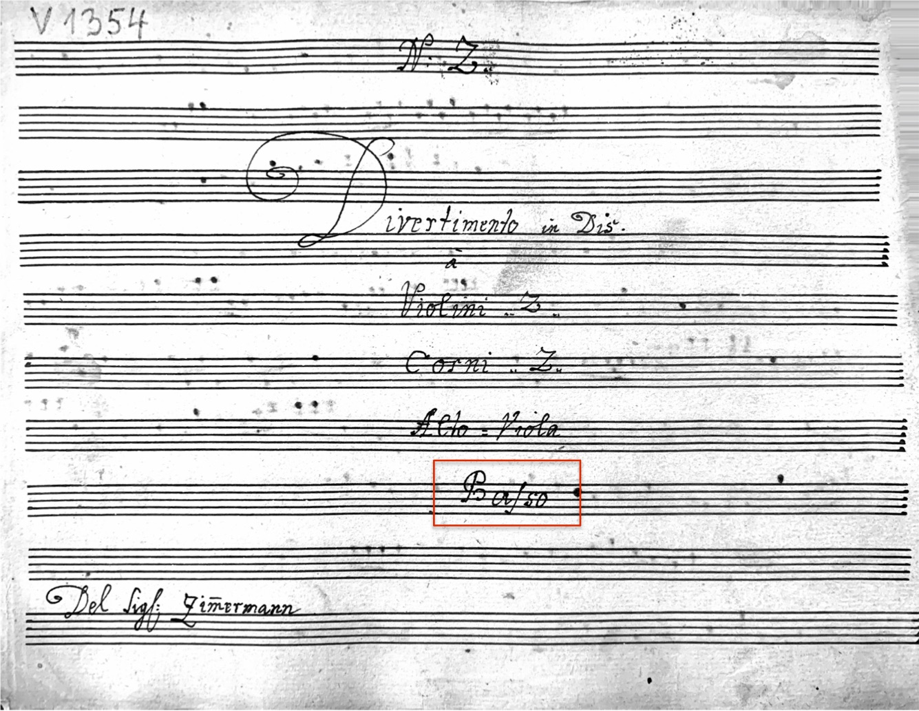 In a significant proportion of divertimento manuscripts, the term ‘basso’ is used to denote the bass line. However, the term ‘basso’ simply means ‘the bass line’ and does not indicate a specific instrument. During the 18th century in Austria, the double bass was referred to as violone or contrabasso. Thus, when these terms or other specific terms such as violoncello or fagotto (bassoon) are used in a manuscript, it becomes clear which instrument is supposed to play the bass line. Nevertheless, given that divertimentos were typically performed with one player per part, the use of the term ‘basso’ to designate the bass line poses a problem in determining the appropriate instrument to play the part.