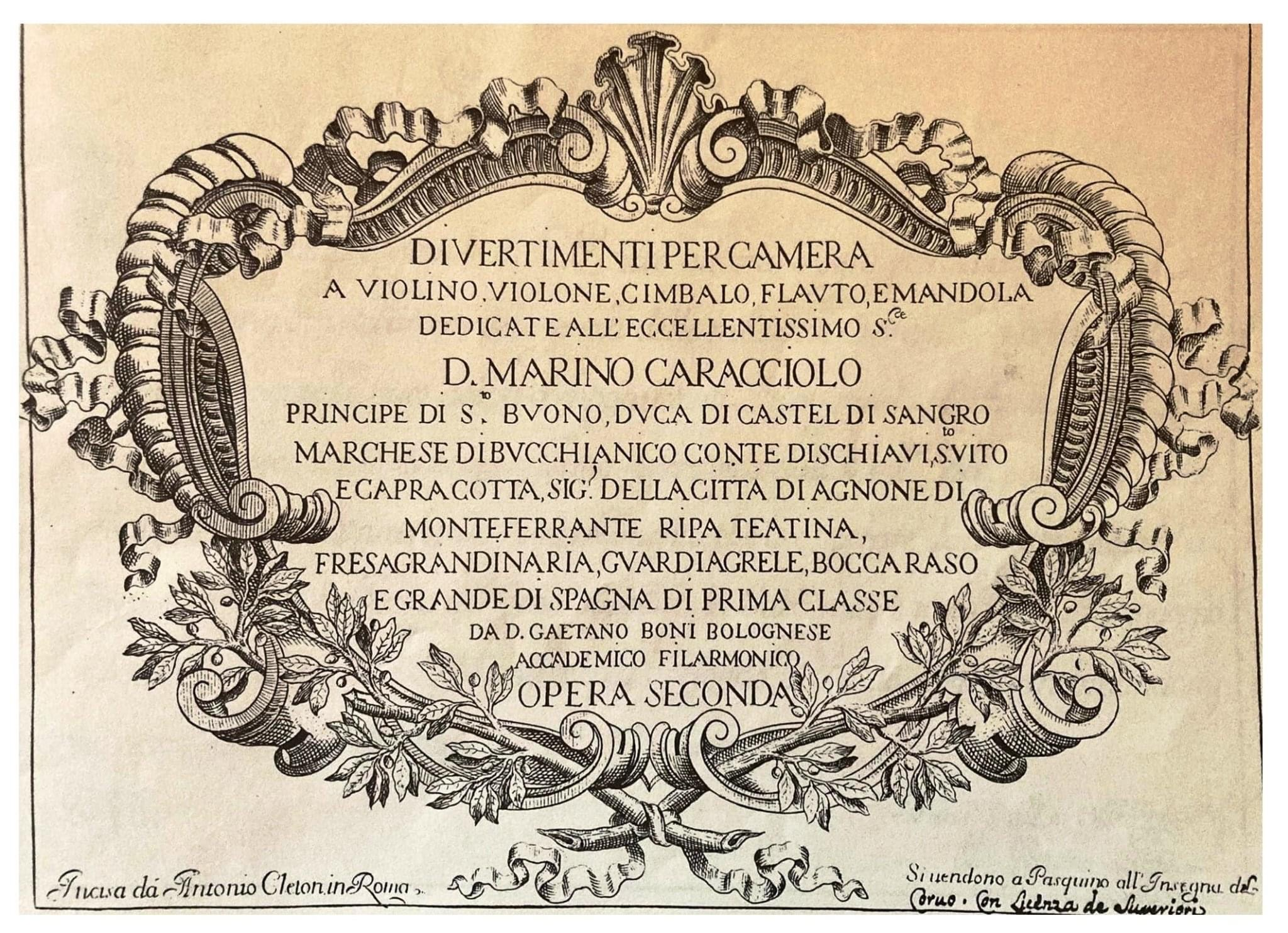 In the early 18th century Pietro Giuseppe Gaetano Boni (2nd half 17 century – 1750) composed his ‘12 Divertimenti per camera a violino, violone, cimbalo, flauto e mandola, op. 2’, which was published in 1720 by Antonio Cleton in Rome (Figure 2).12