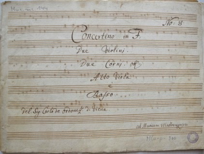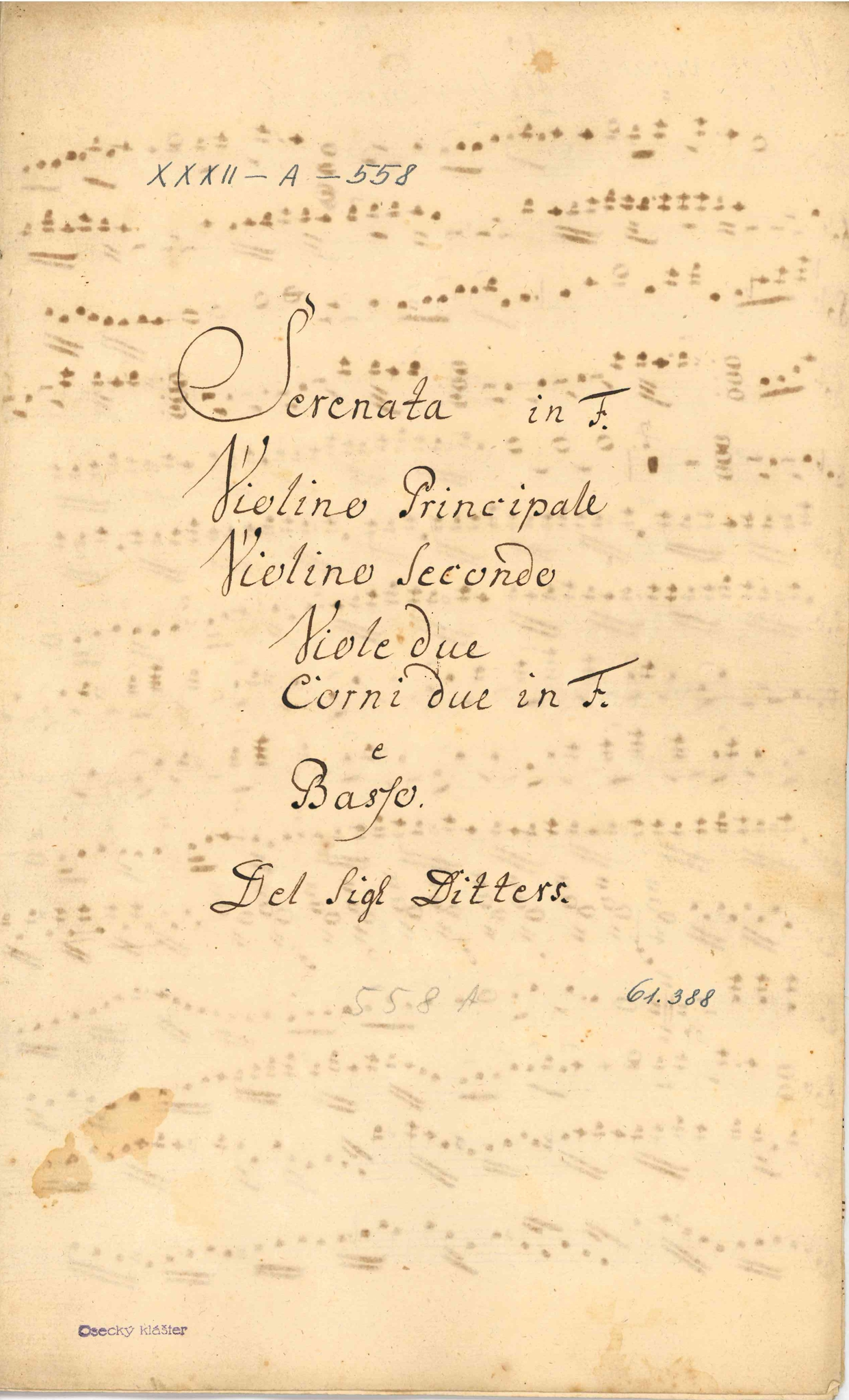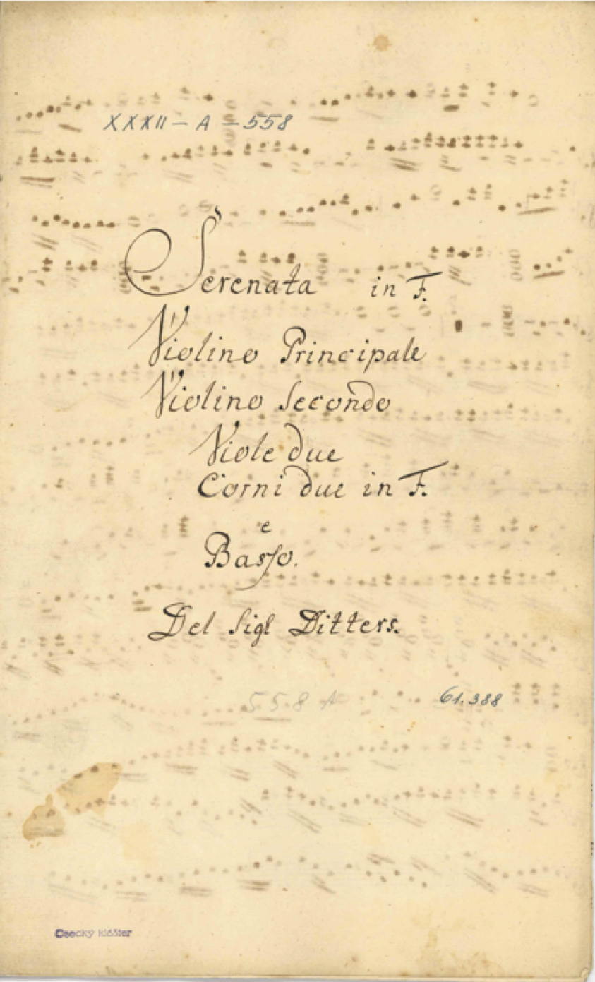 Fig. 15 Carl Ditters van Dittersdorf, Title page and bass part, Serenata in F, Prague, Národní knihovna Ceské republiky (CZ-Pu) XXXII-A-558