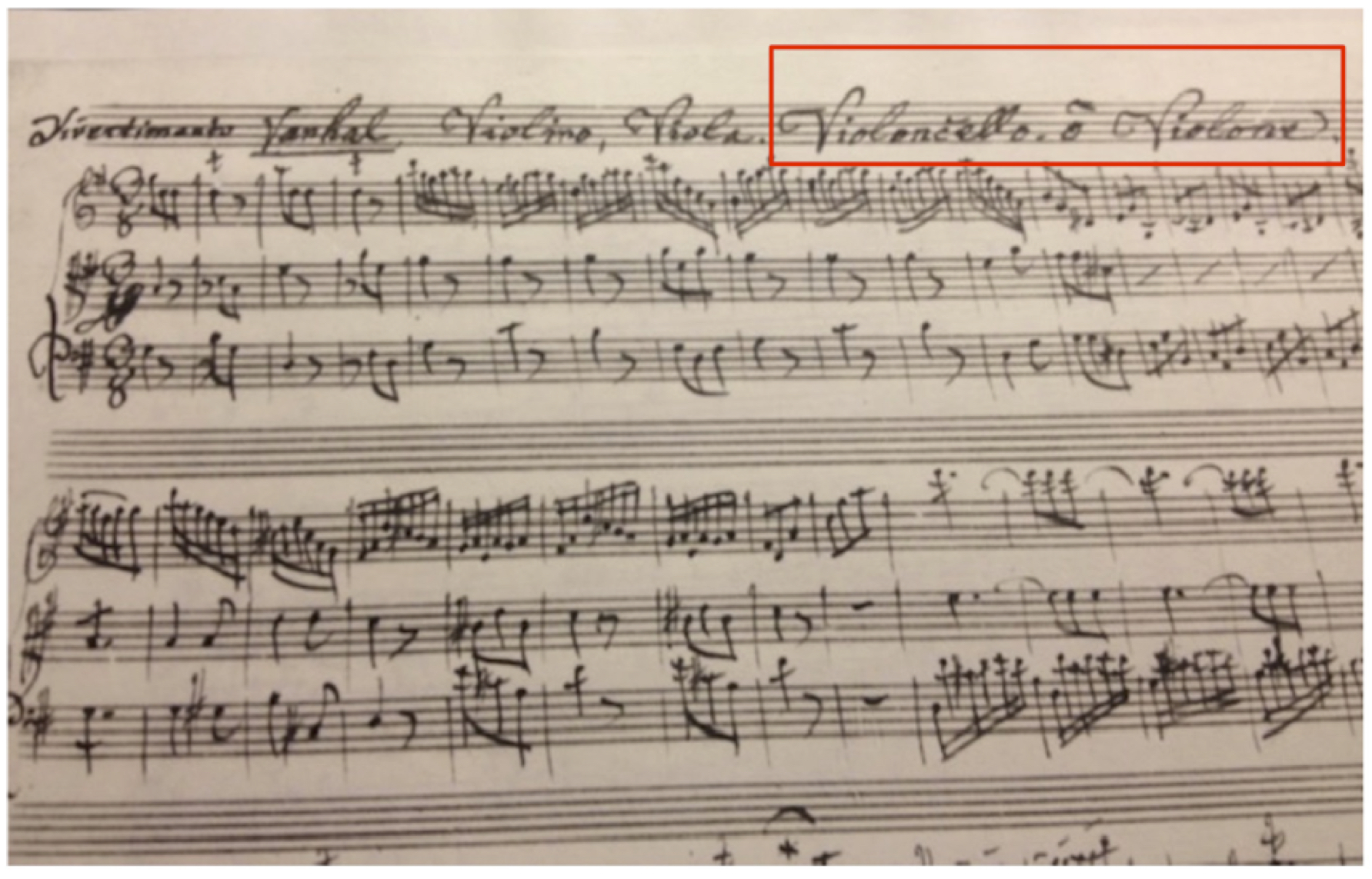 The interchangeable usage of the terms violone, violoncello, and basso is demonstrated in the following examples. One such example is the Divertimento in G composed by Johann Baptist Vanhal, which is suitable for performance by a combination of violin, viola, and either a violoncello or a violone. This illustrates the fluidity and flexibility in the designation of these instruments in the musical context of the 18th century (Figure 50).