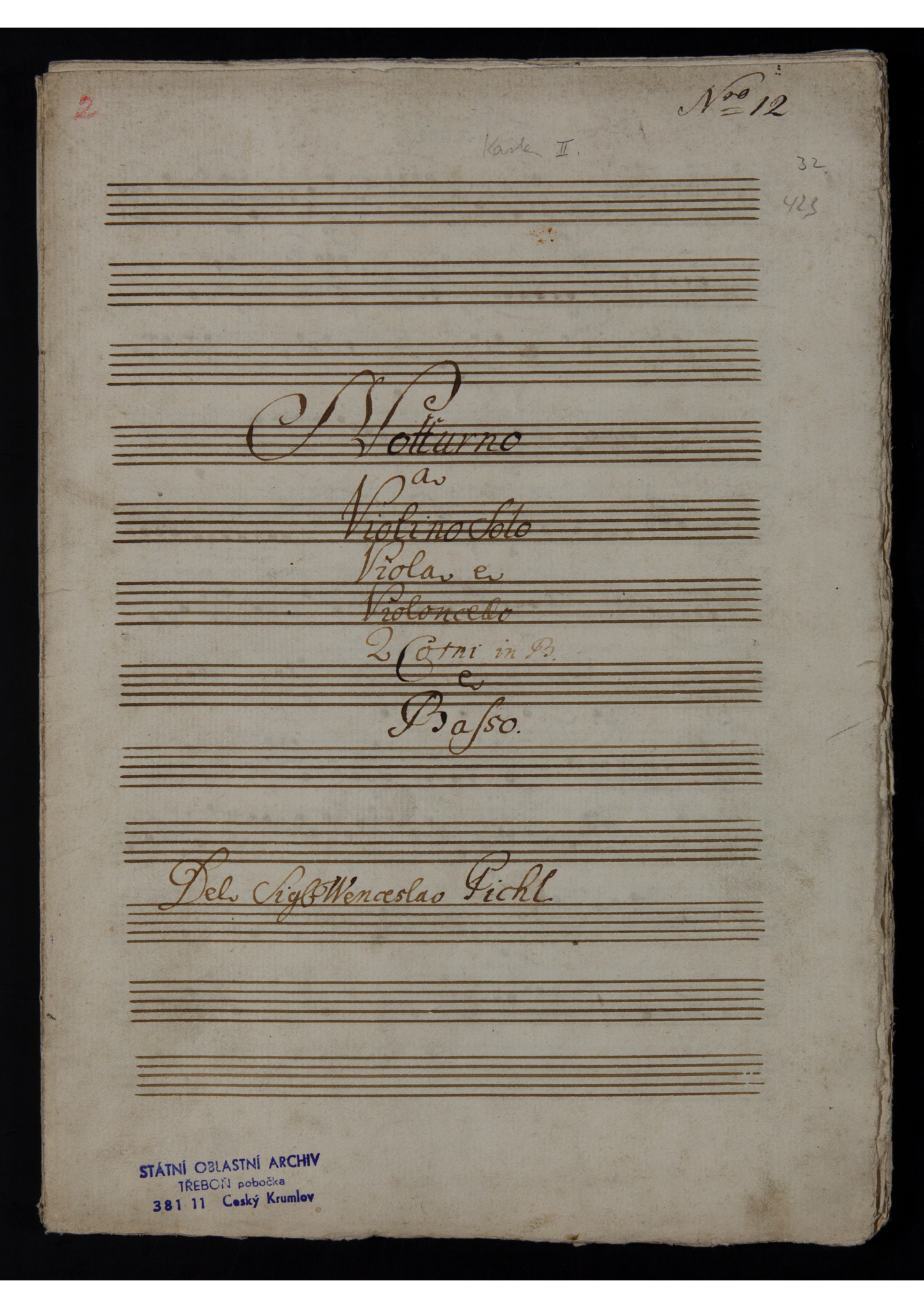 The Prague library also houses a Divertimento by Michael Haydn for the instrumentation of the Divertimento Sextet. The title page of the manuscript refers to the bass line as ‘Violone’, but the bass part is labeled ‘Basso’. There are four instances in the manuscript where the bass line extends beyond the lower range of the double bass. Another manuscript of this piece is also held at the library of Kremsmünster Abbey, but bears the title "Notturno", and unlike the Prague manuscript, both the title page and bass part are labeled ‘Basso’ (Figure 37).