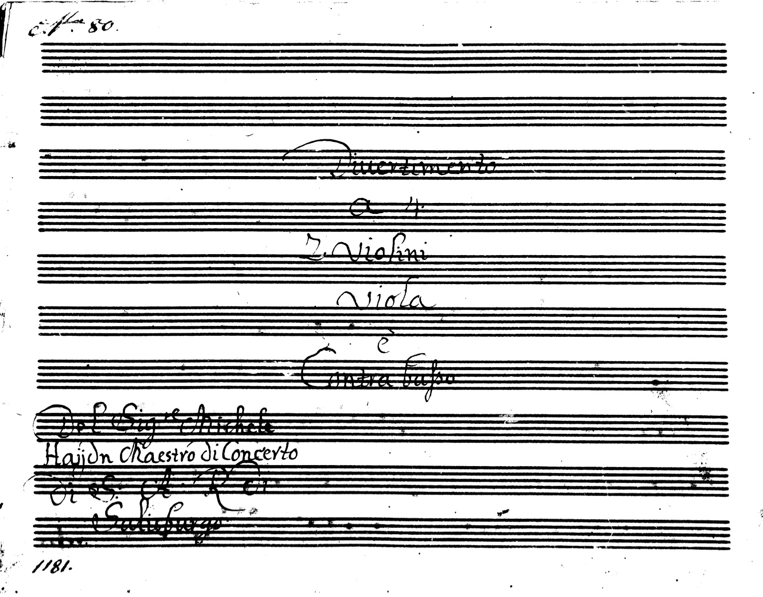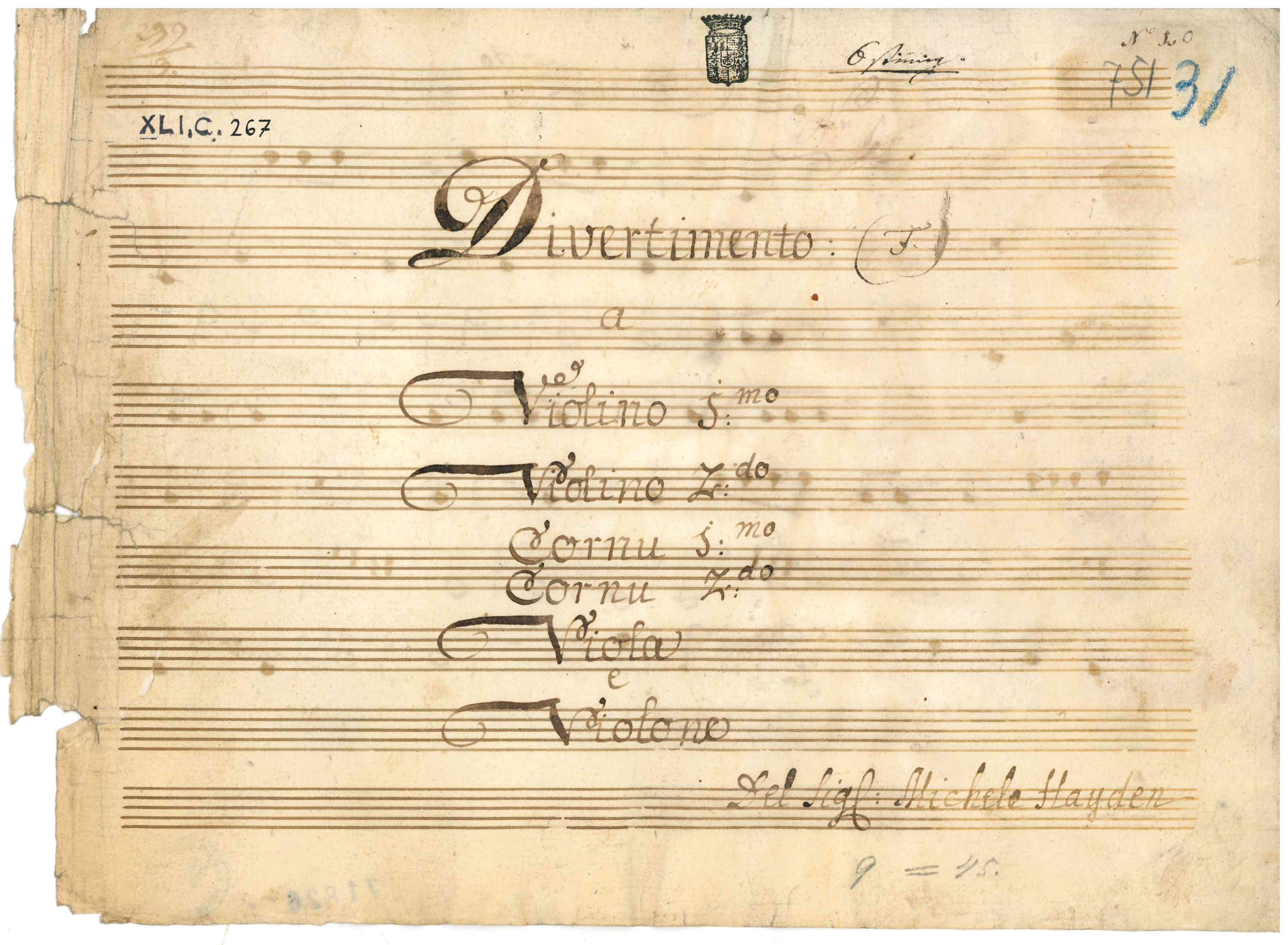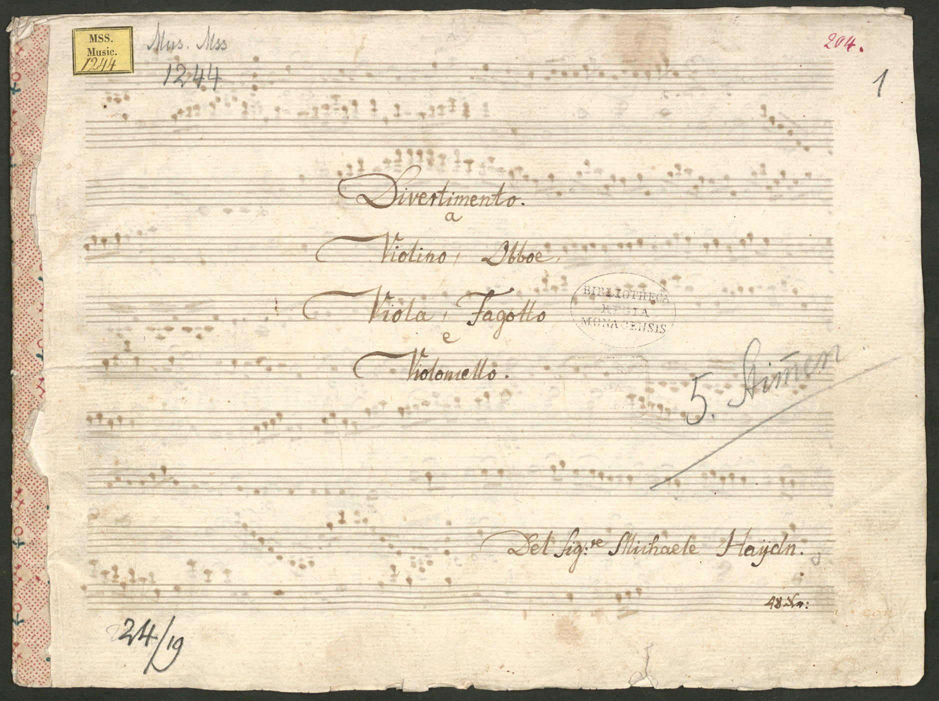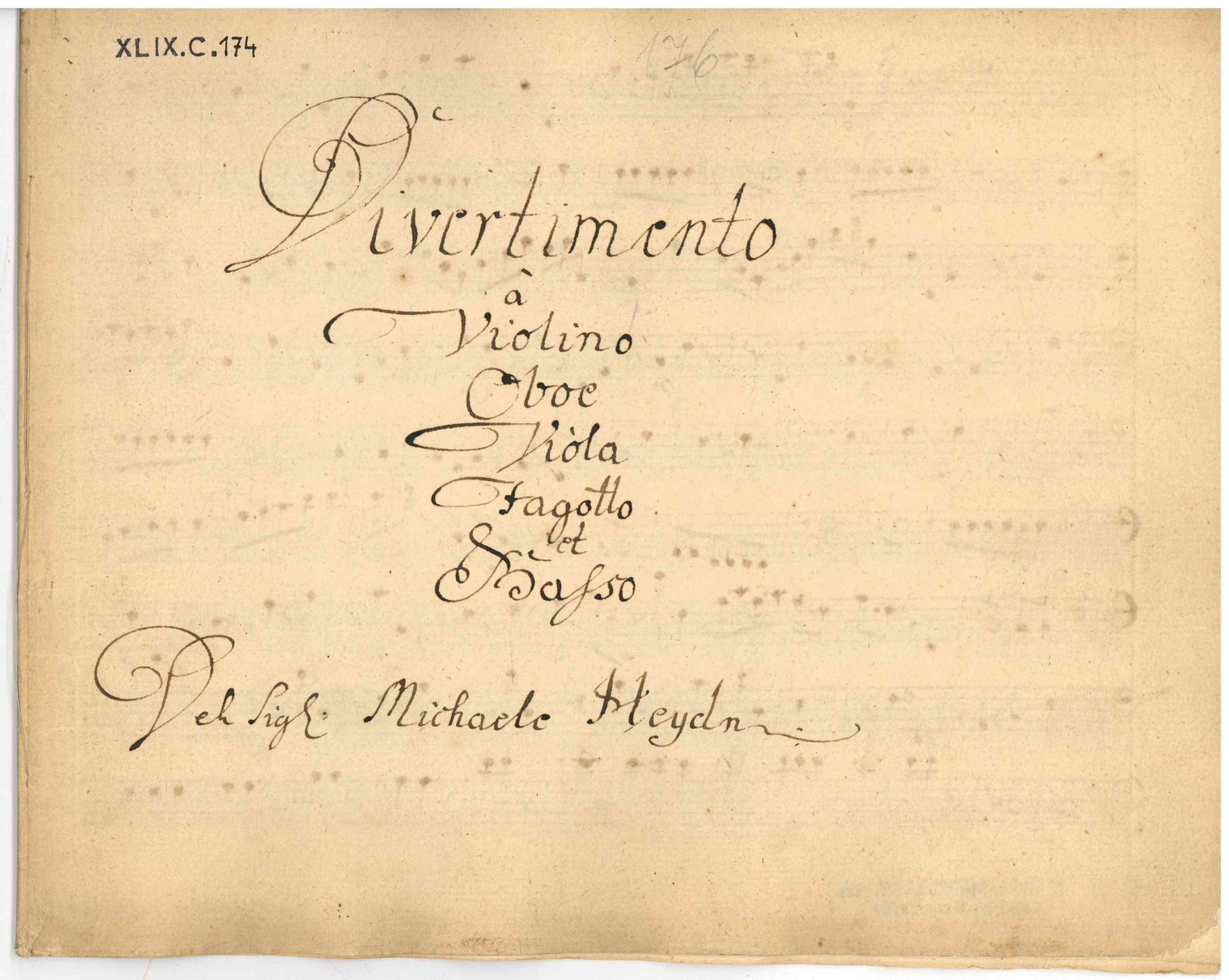 The Divertimento in B-flat for Violin, Viola, Oboe, Bassoon and Violone by, Michael Haydn appears to have been a very popular piece, as evidenced by the existence of several manuscript copies in various libraries such as Kremsmünster, Munich, Prague and Budapest. It is noteworthy that each of these copies has distinct variations in terms of title page and instrumentation, which further underlines the great popularity and use of the piece (Figure 51).