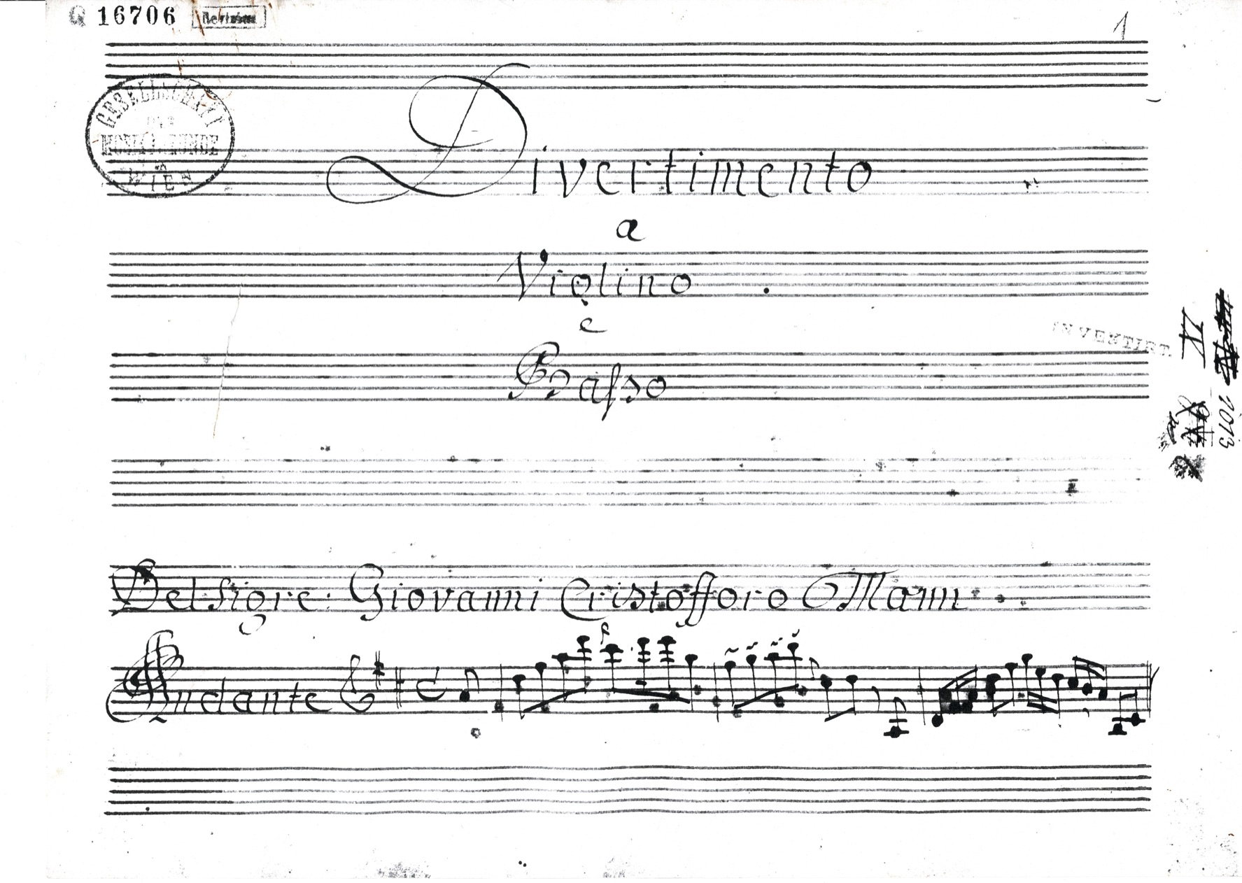 Fig. 3 Title page Divertimento a Violino e Basso, J. C. Mann, A-Wgm Vienna, Gesellschaft der Musikfreunde in Wien, Bibliothek (A-Wgm)