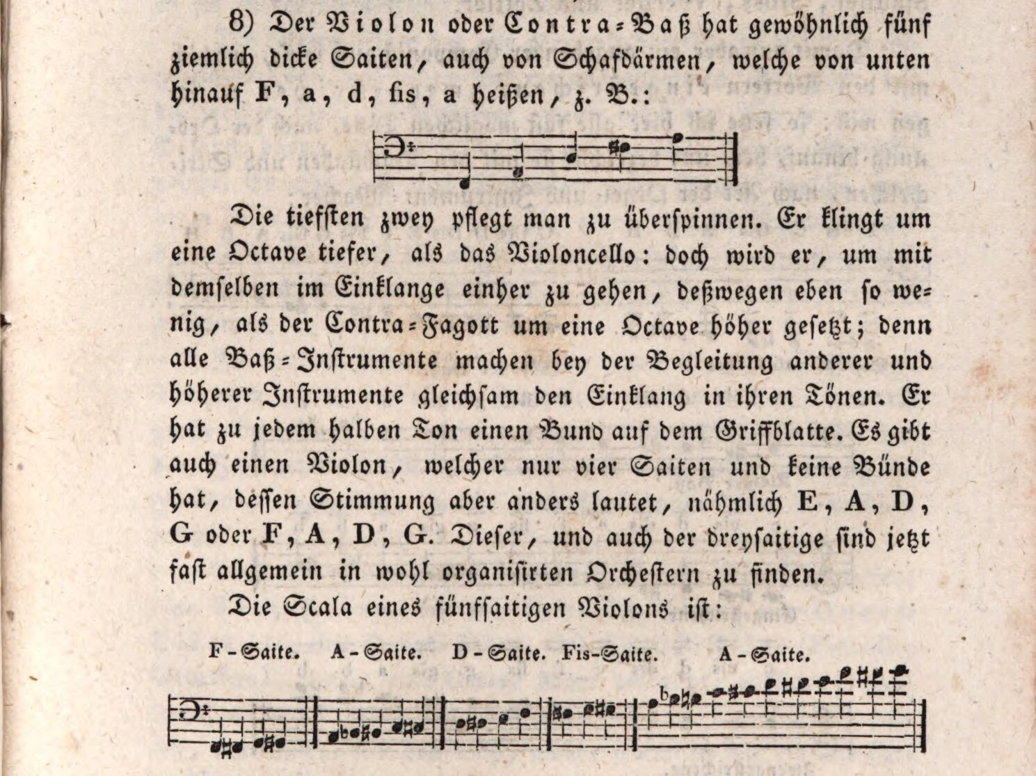 In an 1826 edition of his treatise entitled, Sämmtliche Schriften über Generalbaß, the tuning for the four-string double bass is listed as E-A-D-G or F-A-D-G (Figure 7).