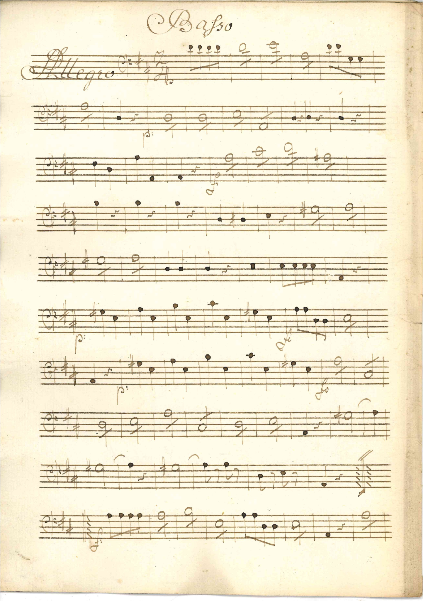 An example of a composition written for the Divertimento Sextet instrumentation is the Cassatio in D major by, Johann Baptist Vanhal, which is housed in the library in Prague. The manuscript uses the term ‘Basso’ on both the title page and bass part, but this does not necessarily indicate that the piece was written specifically for the double bass. The bass part is relatively simple and does not extend below G1, which is within the range of the double bass. However, it's worth noting that the key of the piece might have influenced the range of the bass part, and thus, the specific instrument it was intended for cannot be determined with certainty (Figure 41).