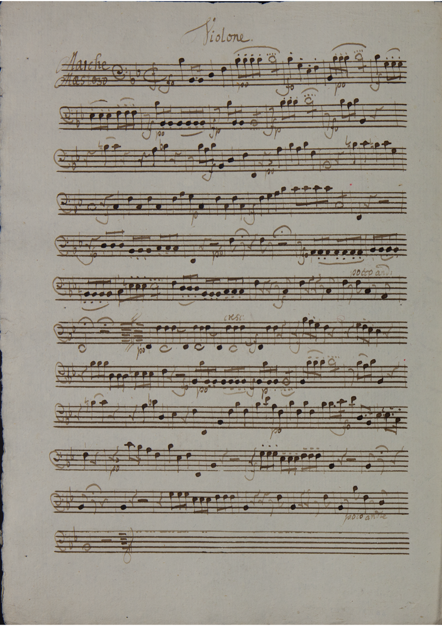 It is interesting to note that the violoncello part in question is entitled "Violoncello ó Fagotto", which suggests that it was originally intended for the violoncello but was later adapted for the Fagotto (bassoon) as well. The use of the word ‘ó’ in the title, which is Latin for ‘or’, further supports this idea. Also, the fact that the writing seems to be by a different hand could indicate that the piece was popular or flexible enough to be adapted to different instrumentation. Further research into the history and compositional origins of the piece could possibly shed light on the reasons for this adaptation and the cultural and musical context in which it took place (Figure 32).