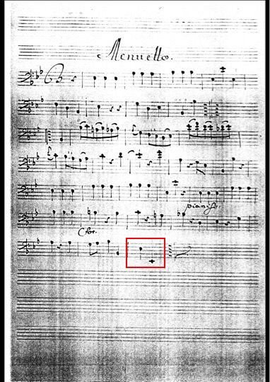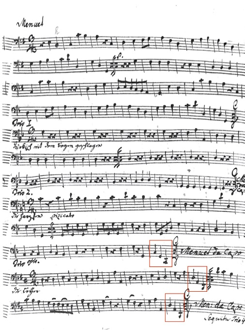 Another example is from a Cassation for Violin, 2 Flutes, Viola, 2 Horns, and Violone by, Anton Zimmermann, which is housed in the library of Kremsmünster Abbey in Upper Austria. On both the title page and the bass part, the term ‘violone’ is used to indicate the bass instrument. There are eight instances in the piece where the notes in the violone part go lower than F1, even down to low C1, all of which occur on weak beats in a cadence. At the time the piece was composed, Zimmermann held the position of Kappellmeister (director of music) in the service of Cardinal Joseph Battyány, in Pressburg (now Bratislava) from 1773 until his death in 1781. The virtuoso bassist Johann Mathias Sperger (1750-1812) was also employed there from 1777 until the ensemble was disbanded in 1783. It is known that Sperger only played in the (Viennese) tuning of F-A-D-f#-a in his lifetime. This raises the question of how these notes below F1, especially the low C1, can be explained. Most likely the piece was written in Pressburg and then copied for use at Kremsmünster. It remains uncertain whether the violone at Kremsmünster was tuned down to low C1 or if Zimmermann simply wrote the bass line without regard for the tuning of the violone. Notably, Trio 1 of the Menuet is indicated as ‘mit dem Bogen geschlagen’...'hit with the bow', a specialty bassists!(Figure 33).