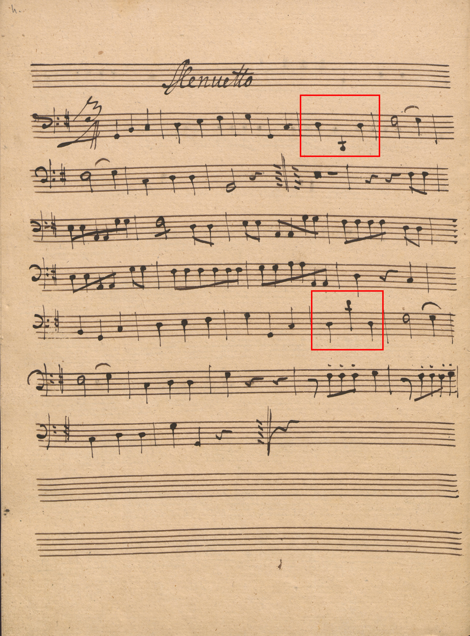One such exception occurs in the Duetto for Violone and Viola, by Karl Ditters van Ditterdorf. He wrote this piece around 1769 for double bassist Friedrich Pischelberger when they both employed by Bishop of Grosswardein (now Oradea, Romania). The instrument Pischelberger used was the typical 5-string Viennese bass tuned F1-A1-D-f#-A. In the Menuetto the bass part reaches down to a low Eb1. This the only time in the entire piece that range extends lower than the lowest note of the double bass. How can this be explained? James Webster suggests that in such an instance the E-flat is on the weak beat of a cadence and could be considered a composer’s slip of the pen (Figure 26).87