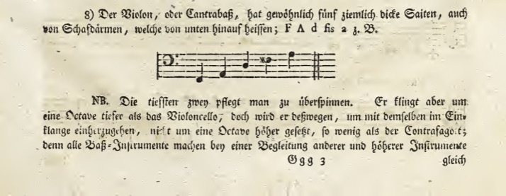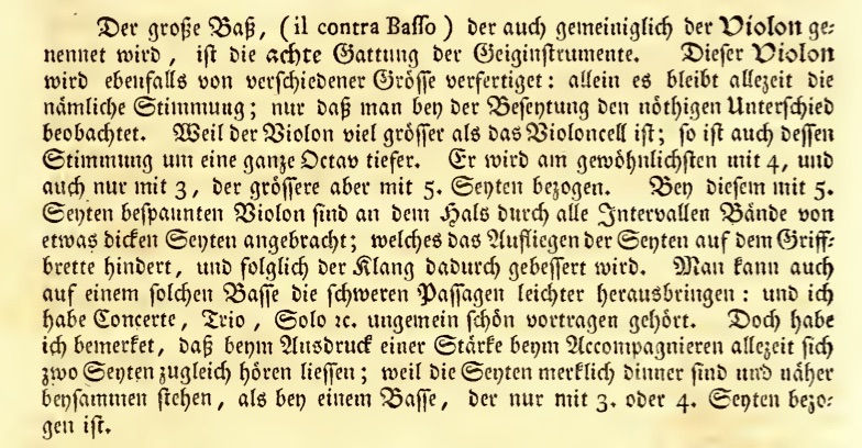 Albrechtsberger refers to the double bass as Violon or Contrabaß and states that the five strings are made of sheep gut, the lowest two of which are wound (with metal wire). Similar to the viola da gamba, a fret is placed at every half step on the neck of the instrument. He also mentions that there are four-stringed double basses (Violon), that have no frets and are tuned either G-A-D-G or F-A-D-G.