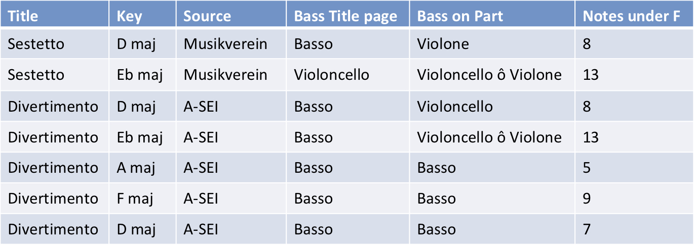 Through examining these manuscripts, I have made a number of observations that will help me conclude whether the double bass could have been the standard bass instrument in the Divertimento Sextet. I have noticed that there are a variety of titles used for divertimentos, even for the same piece. Additionally, since the lowest note of the double bass in 18th century Austria was either F1 or E1, it was essential to examine the manuscripts to see how the bass part behaved in relation to notes lower than the range of the double bass. I have come across works in which the term Violone appears on the title or in the bass part in which the bass line extends lower than the range of the double bass, practically all on the weak beats of a cadence, raising the question if this could have been a “composer's slip of the pen”. I have also found works with only Basso on the title page and bass parts with notes extending lower than the range of the double bass. Further there were works with only Basso on the title page and bass parts with notes not extending lower than the range of the double bass. This does not necessarily mean that these pieces were specifically written for double bass, but that the notes could have stayed in a certain range due to the key in which the piece was written. I have discovered compositions with Violoncello ò Violone in the title page or on the bass part, as well as manuscripts from various libraries in which one source refers to the work as Violoncello and another as Violone, indicating that either instrument may be suitable for performance of the piece.
