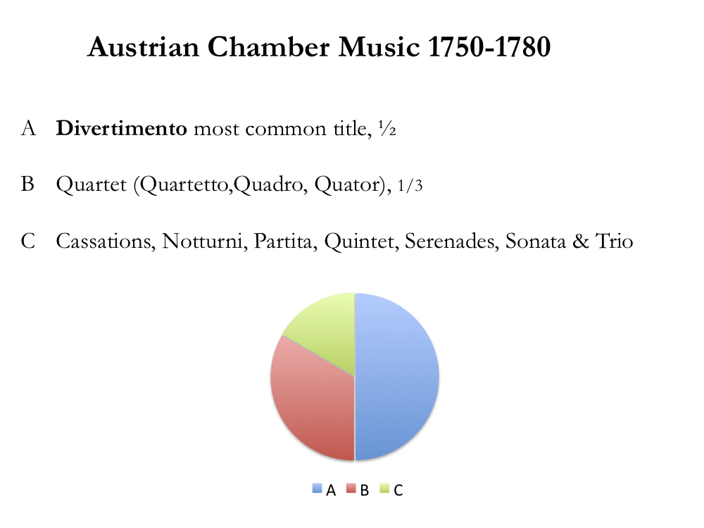 In the period from 1750-1780 the title Divertimento was the most commonly used for Austrian chamber music, appearing in local sources for nearly half of the works. The second most common title was Quartet, which accounted for approximately one-third of the works. Other frequently used titles included Cassation, Notturni, Partita, Quintet, Serenades, Sonata and Trio (Table 1).27
