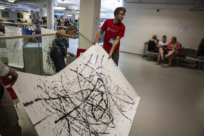 Equally, when thinking of bare activity and art as a process, I might think of the workshop on collaborative art in Tallinn in the summer 2014. In the workshop we, the participators, held together a large piece of paper. We set a ball saturated in ink on the paper and started to move the paper, letting the ball do its work and write its stories.