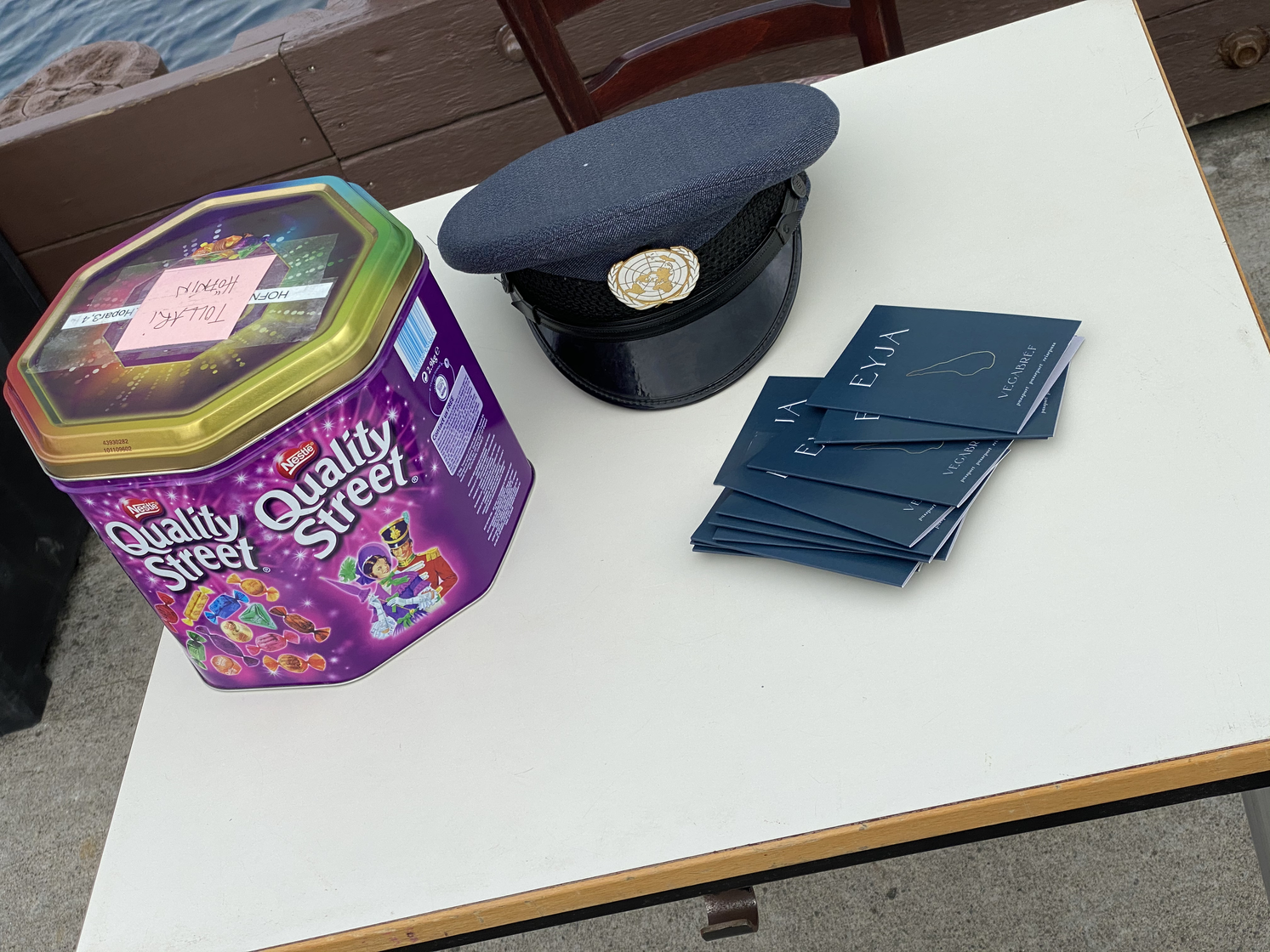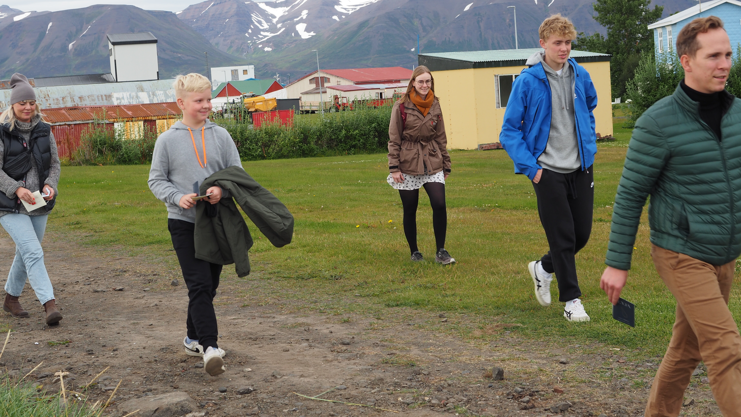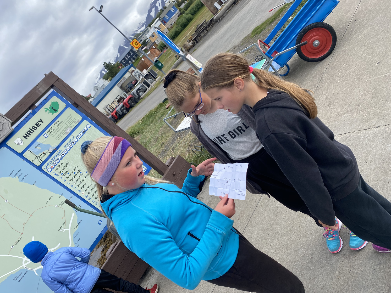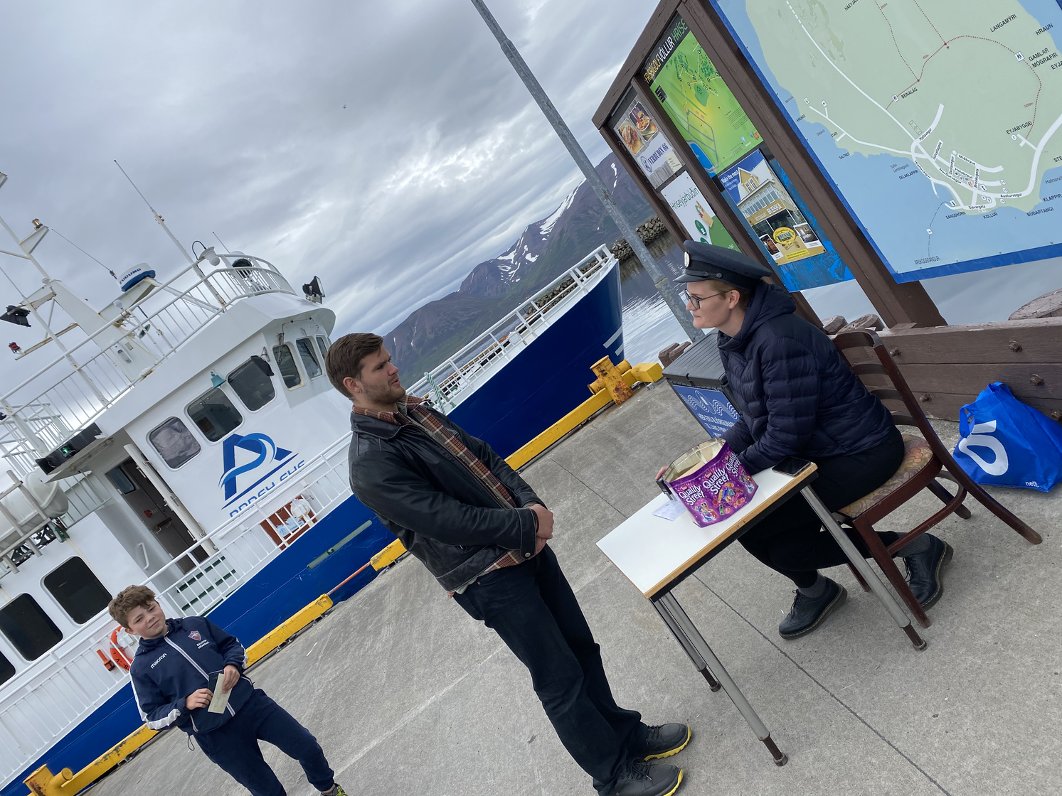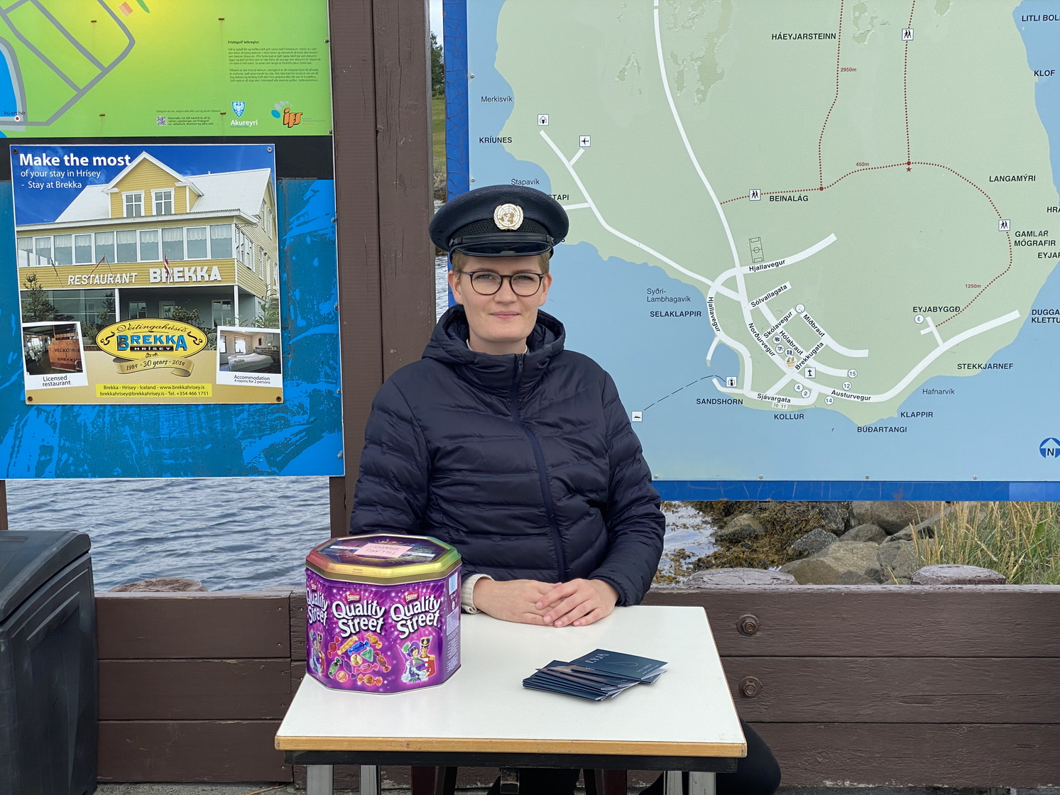 In the performance, the children of Hrísey were the local guides. They waited at the harbour for their guests, that brought with them Eyja-passports to be stamped in different stations on the island. The first stamp they got from Gréta, in her role as a toll guard. She also provided the guests with a map and a personal secret mission.