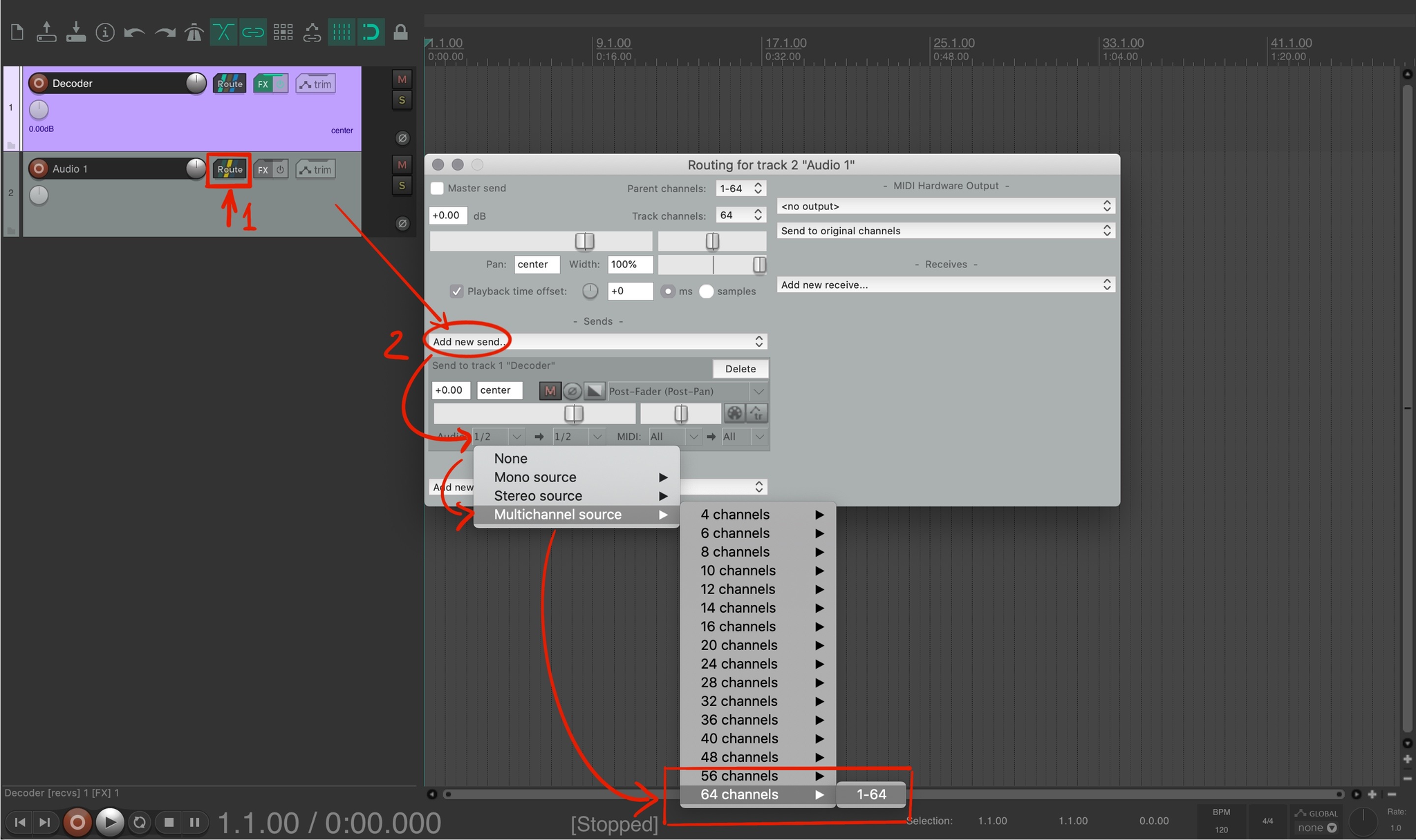 The first thing to do, is to set up the routing. From the Routing tab, after we have made sure that our track has 64 channels and the master send is disabled, we add a new send to our decoder, with a multichannel source, sending ch. 1-64.
