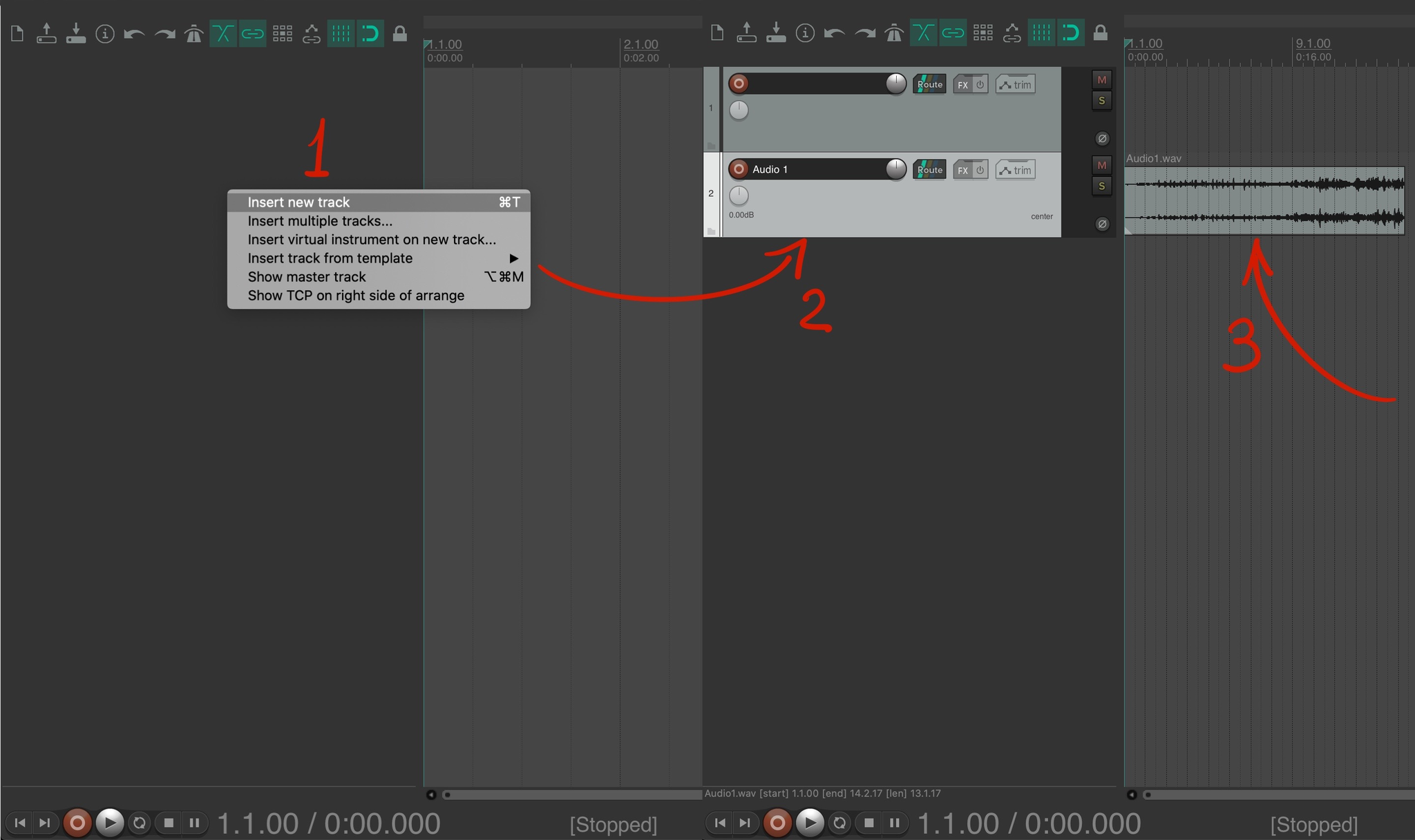 Right click on the left bar and insert two tracks, then we can easily drag and drop a new stereo file in one of the two tracks. The track where our sound file is will be where the encoding into Ambisonics will happen, and the empty one will become our decoder. You can also assign a new color to your decoder track and rename it.