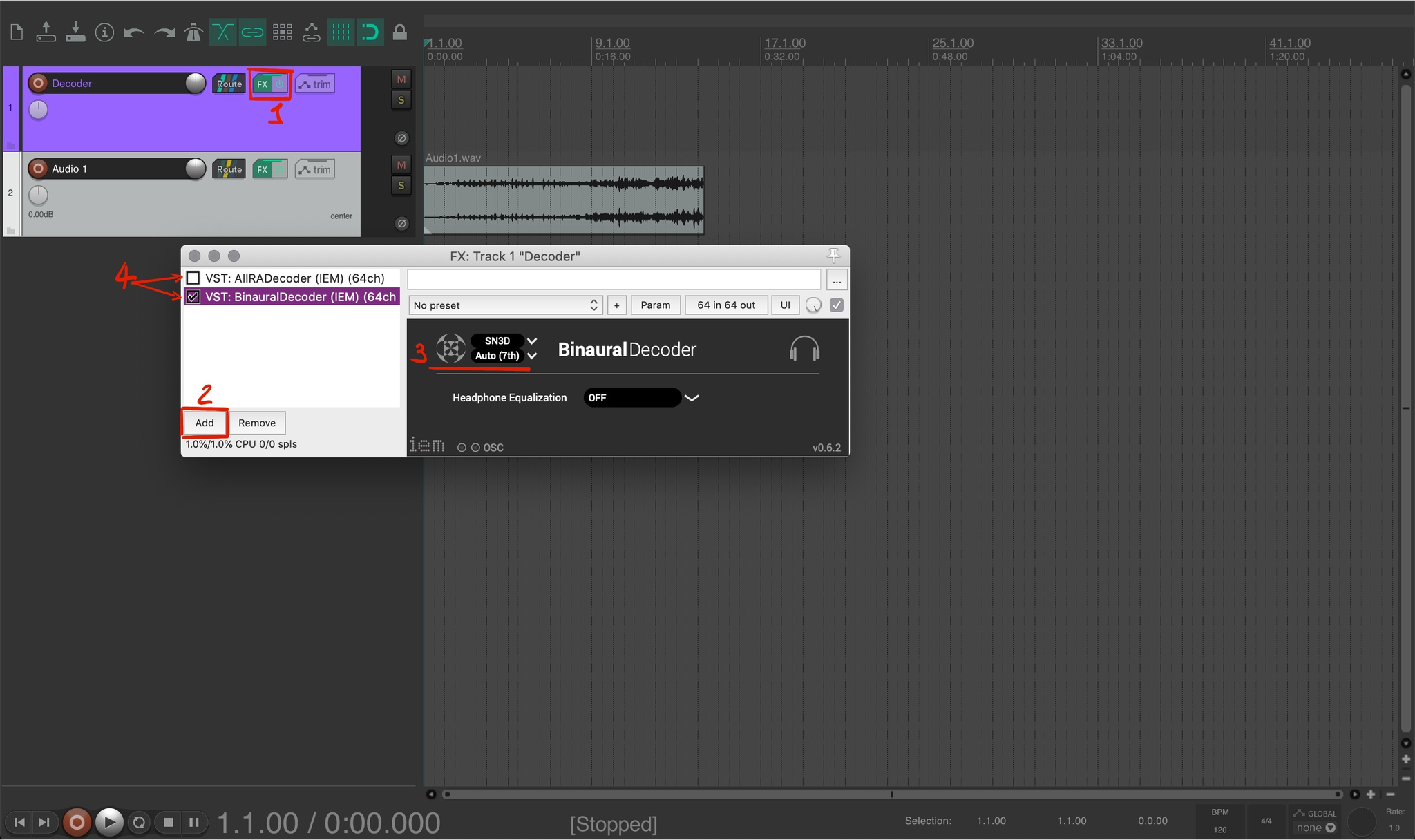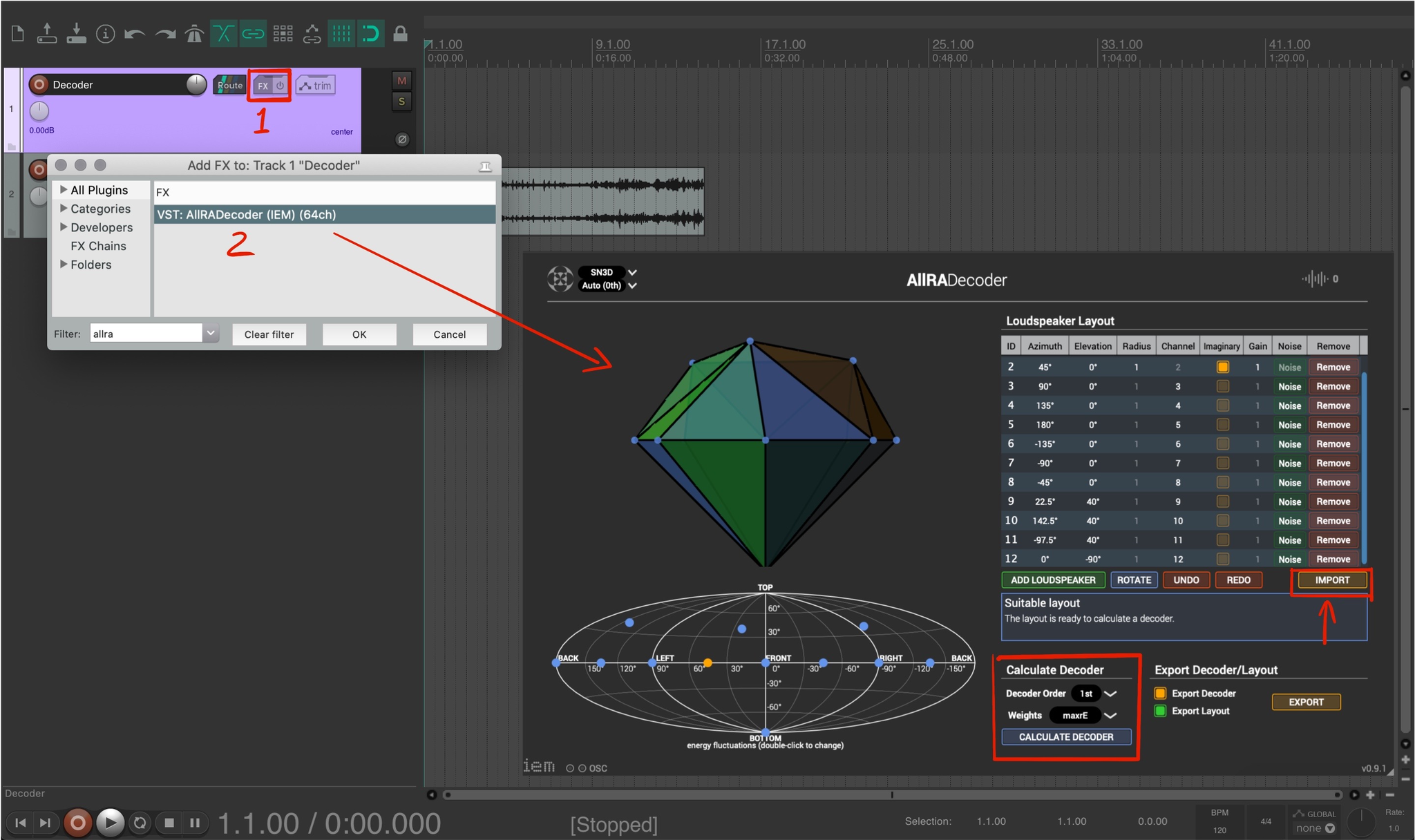 Now let's make our decoder. To do so, we need to load an instance of IEM AllRADecoder in our Decoder track. We can do it through the FX tab.