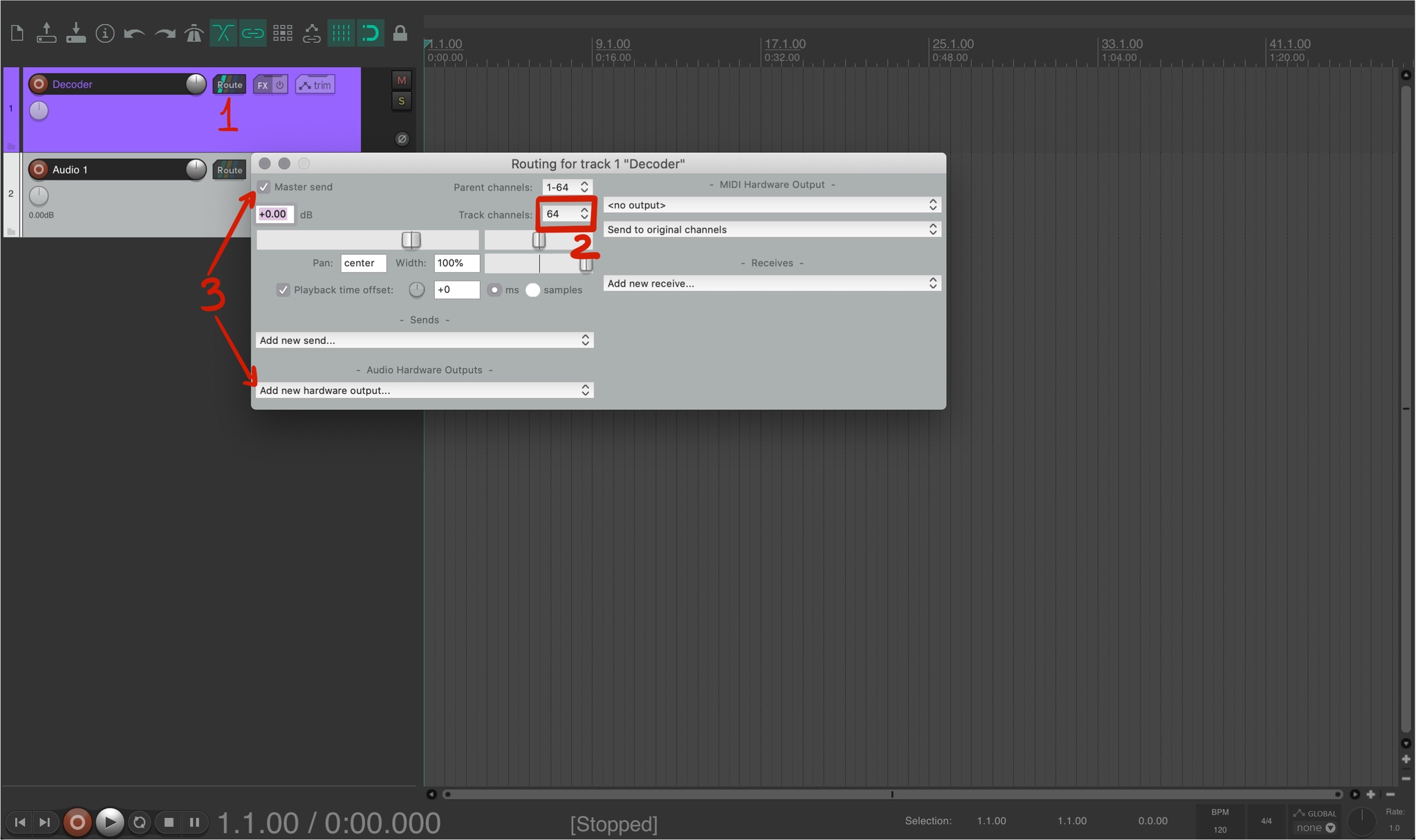 Also we need to set the destination of our decoder. Reaper has a hidden master track that every new track will be by default sending to. It can be accessed via View > Master Track. We will have to make sure that also that track will be sending out enough channels for how many loudspeakers we are using. Alternatively, we can disable the Master track and autonomously set a hardware output. This can be useful if we need to set up more complex routings.