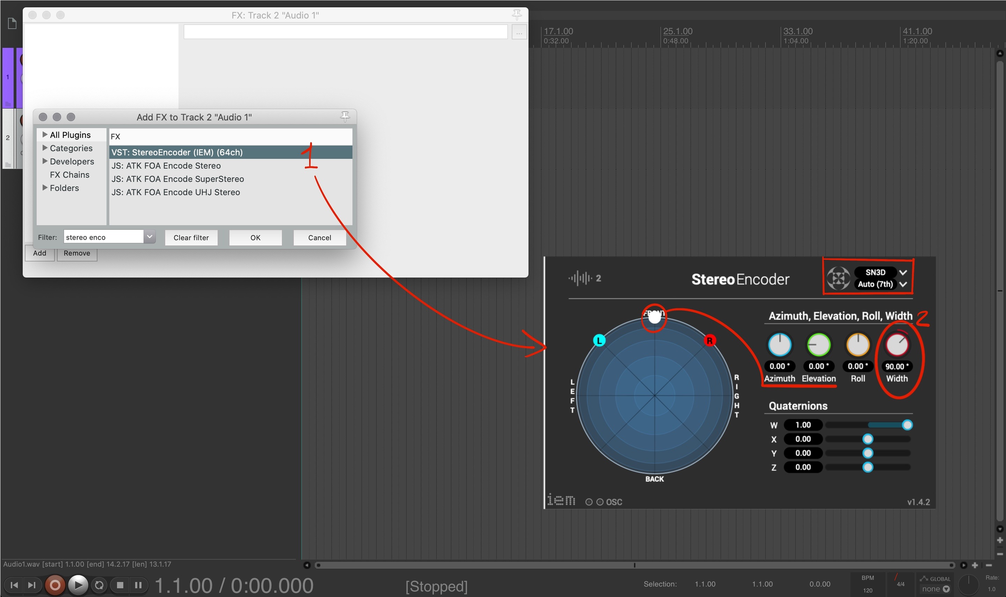 In this short guide we will look at how to set up a basic VST chain and how to manage signal routing to work with Ambisonics, using Reaper and IEM plugins. We will encode a sound from stereo to B-Format ambisonics and then decode it back on a speaker setup using the AllRad decoder or over headphones using a binaural decoder.