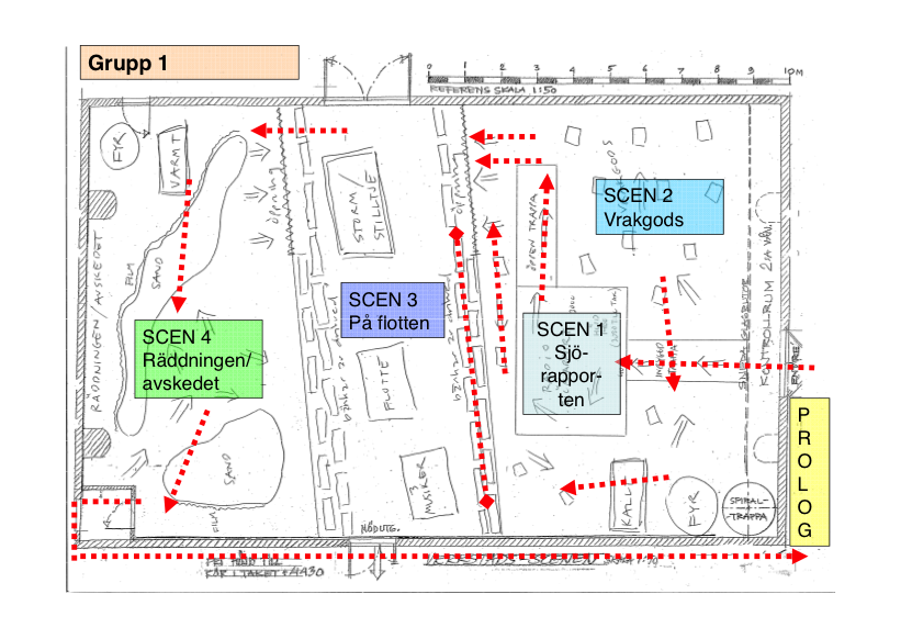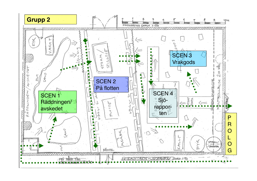 The narrative in Ps! is non-linear. The parts can be assembled in different ways to provide different meanings. Thus, focus is on the individual experience. In the piece the audience is divided into two groups, each group guided by an actor and following the piece clockwise and counterclockwise. There were no chairs so the audience was free to move about or sit down as they wished, scenography allowing (for a sketch on the audiences trail - see Image 12 below). The piece opens with the two actors telling the tale of Calle Petterssons shipwreck.