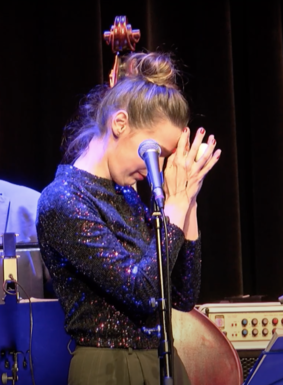 I feel a bit embarrassed about this announcement. I wanted to bring the attention to the fact that Hans Strasser, the bass player, is not playing this concert with one of his own instruments but with a borrowed instrument, which can be quite a challenge. So, I wanted to show how well he is dealing with an instrument he barely knows. But now watching and re-watching it, I realize that I use the “shifting into private Julia mode” and put it onto Hans. I now realize by telling this story, mentioning his wife, I shift Hans from Hans Strasser the bass player to private Hans. I never realized that. Hans is someone the audience always reacts strongly to, after his soli he always gets immediate and strong feedback and I often jump on to that feedback to further strengthen it by putting him even more in the spotlight. I want to make sure Hans is approachable to the audience. I usually don’t ask the musicians on stage direct questions, or encourage them to talk, but now that I think about it, I probably should do it more and I would very much want to know what would happen if I do. I only sometimes ask direct questions to mathias, the pianist; as he is the arranger and I want to establish that fact through asking him questions about his arrangements or sharing background stories about his process. He is always to my right on stage, and sometimes he just starts talking pushing me to directly react. Now I see that I usually tend to putting the spotlight onto the musicians when before or after they are also featured with a solo part in the music. I try to build my talking around their “spotlight” moment in the music expanding it to the moments between, before or after the song.