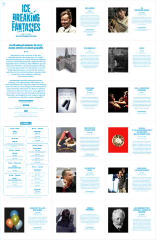 Run jointly by the University of the Arts Helsinki and the Aalto University, the TAhTO Doctoral Programme in Artistic Research organized a festival, Ice Breaking Fantasies, held from 19 to 27 September 2014 at the Kuva/Tila exhibition space in Punavuori, Helsinki. The week-long festival was open to everyone interested in art and artistic research. Featuring performances, concerts, installations and video art, the festival introduced art and artistic research to wider audiences, injecting it into urban culture. Ice Breaking Fantasies features ten artists from the TAhTO programme who study at the three academies of the University of the Arts Helsinki and at the school of Arts, Design and Architecture in Aalto University. Planned by the doctoral students themselves, the event represented a new approach to art and artistic research. Instead of an academic conference, participants presented and developed their research in an event that was open to the public.