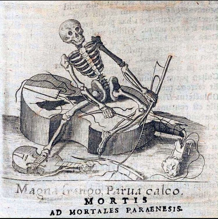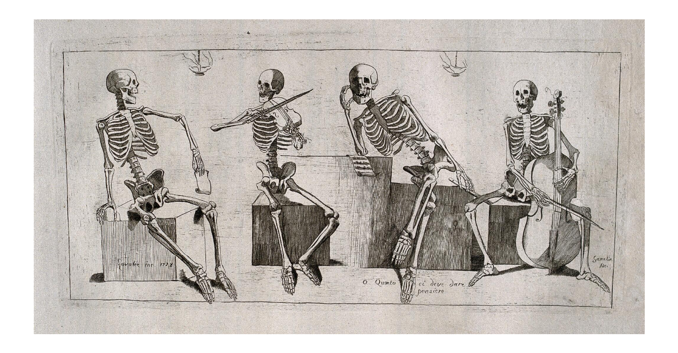 Lavalée after J. Gamelin, 1778,Four skeletons with musical instruments. Etching.Wellcome Collection https://wellcomecollection.org/works/f33w7jru (last access on 20/02/22)