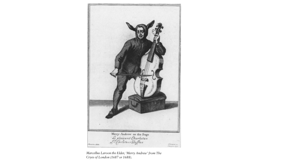 Laroon Marcellus, 1688, Merry Andrew on the stage, from bound series of the Cries of London Etching, British Museum https://www.britishmuseum.org/collection/object/P_L-85-63 (last access on 20/02/22)
