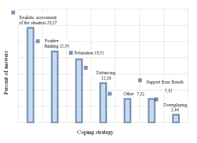 Strategies of coping with stage fright in the study group (Napora, Wojciech, Stec, Adrianna, 2020, Częstochowa, Trema u artystów występujących publicznie. Wybrane psychologiczne uwarunkowania i sposoby radzenia sobie z tremą. Społeczeństwo – Kultura - Wychowanie. Wydawnictwo Uniwersytetu Humanistyczno-Przyrodniczego ISBN 978-83-66536-07-4)[10:2]