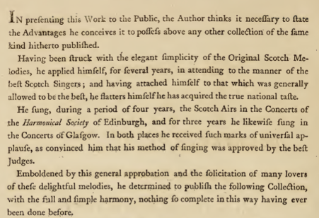 It may be objected that the simple beauty of the Caledonian Melodies needs not the complex aid of harmony; and that the mere grace and tenderness which they borrow from Nature, are lost in the laboured Accompaniments of Art, - But, whilst the air is preserved in its genuine simplicity…it must heighten the relish of the melodies to every person of accomplished taste, when the Science of music is employed…110