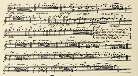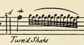 The strange x symbol (and its absence from Barsanti’s other compositions) might likewise be explained by a roll, or some other kind of articulatory ornamentation. After all, the main difference between a roll and Geminiani’s “turned shake” is a matter of speed. If executed quickly enough, with straight fingers, and with a barely-perceptible lifting of the fingers off the tone holes, Geminiani’s “turned shake” could easily end up sounding like a roll. This would also explain why some turned shakes in Barsanti’s Collection are written out in full, as this notation leaves less room for interpretation.